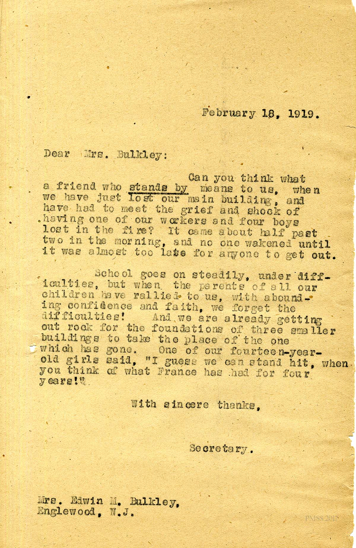 1919 March 12, 1919 To Mrs. Henry I. Budd from PMSS thanking her for her recent donation to the School after the Burkham School House I fire and destruction.