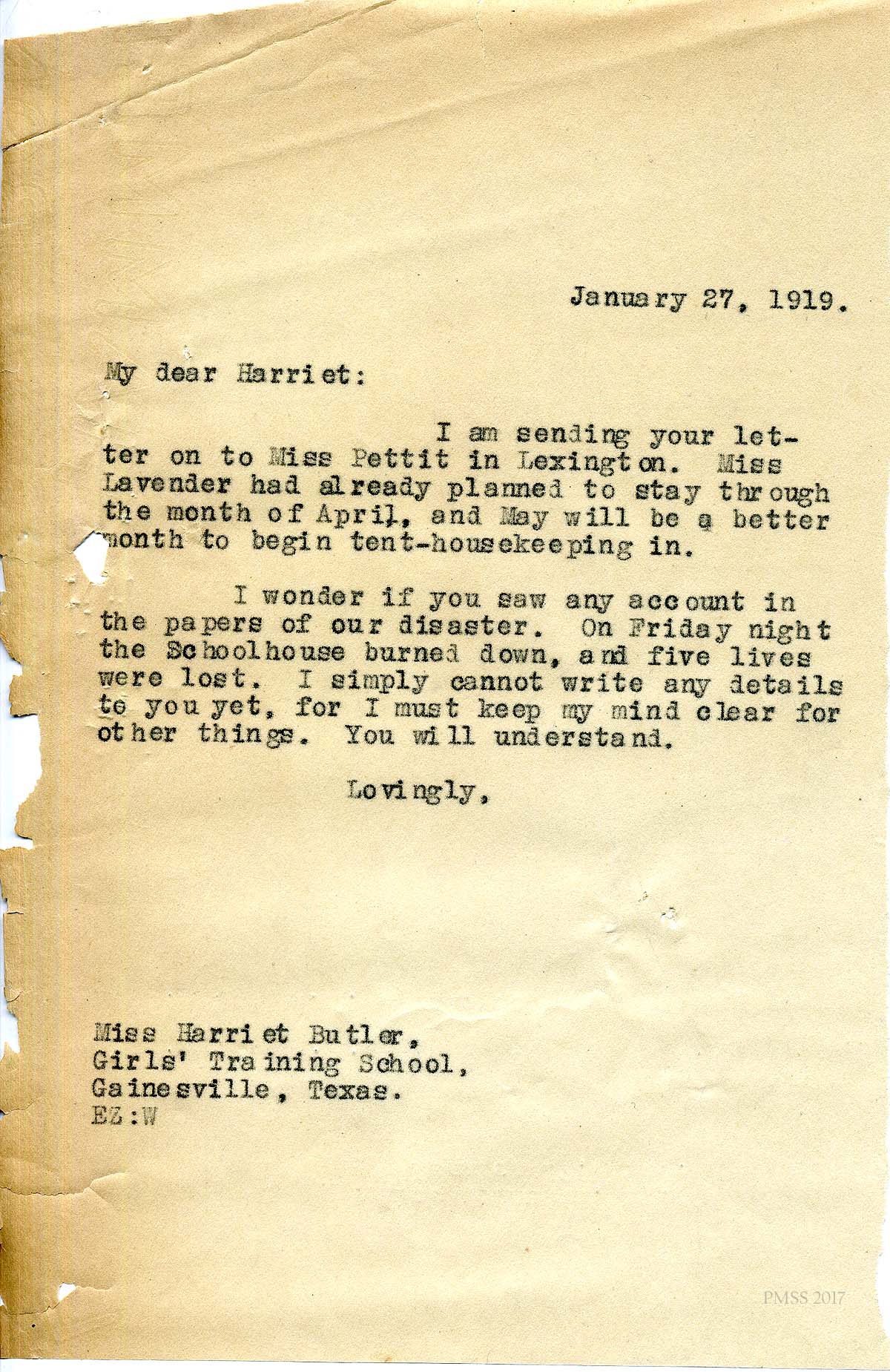 1919 January 27 To Harriet Butler [nurse at Medical Settlement] at the Girl’s Training School, Gainesville, TX,. from Ethel Zande. alerting her to the destruction of Burkham School House by fire.
