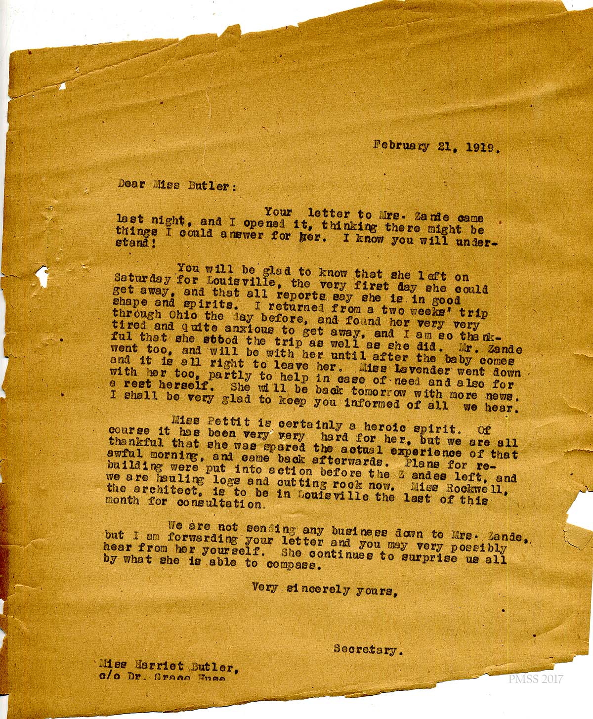 1919 February 21 To Harriet Butler from PMSS Secretary in response to Butler’s reply to Ethel Zande note regarding the fire and destruction of Burkham School House I. Reports on the health of Ethel Zande as she prepares to give birth to Alberto Zande in Louisville. Notes that Frances Lavender is with Mrs. Zande. “…Plans for rebuilding were put into action before the Zandes left, and we are hauling logs and cutting rock now. Miss (Mary) Rockwell, the architect, is to be in Louisville the last of this month for consultation…”