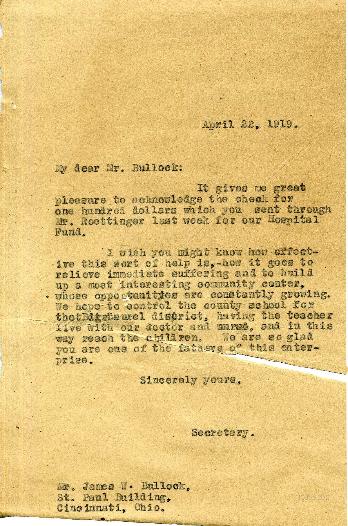 1919 April 22 To Mr. James W. Bullock, St. Paul Building, Cincinnati, OH from PMSS thanking him for the recent donation to the school through Mr. [Philip] Roettinger, a member of the Board of Trustees of PMSS, for the rebuilding after the fire and destruction of Burkham School House I.