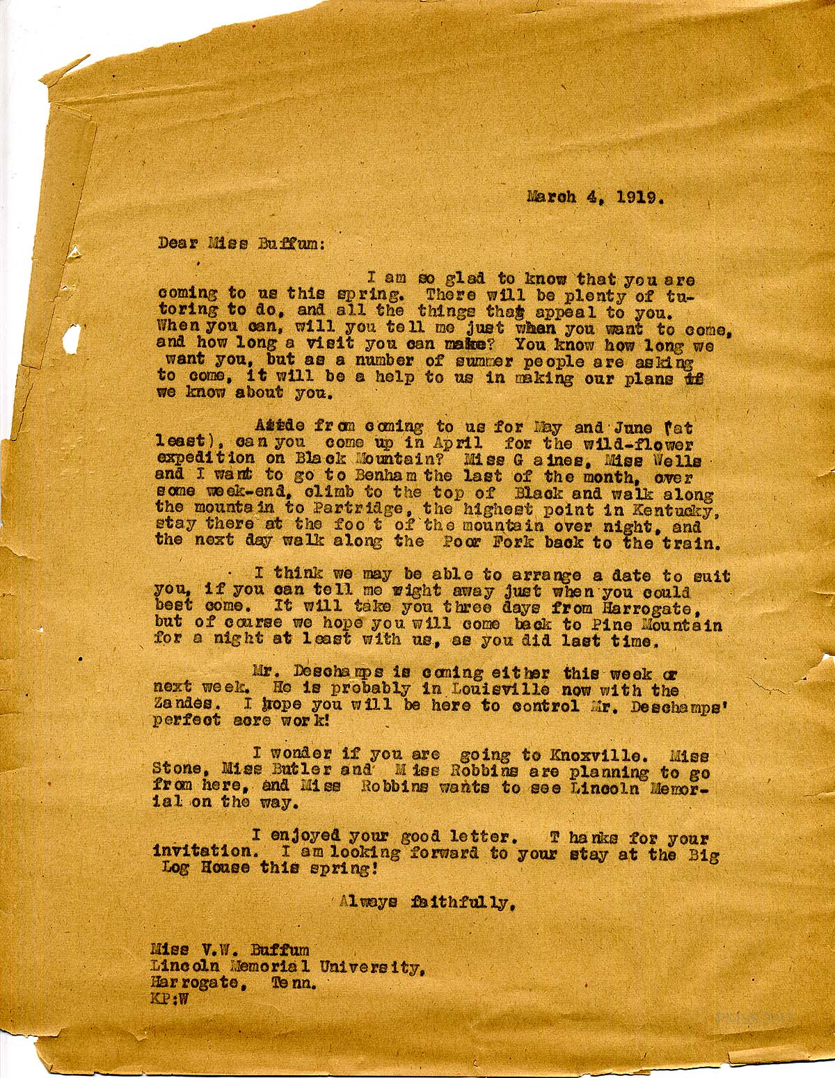 1919 March 4 To Miss V.W. Buffum, Lincoln Memorial University, Harrogate, Tenn. from Katherine Pettit inviting her to come to PMSS to tutor and for a Black Mountain Wildflower Weekend [First mention of the annual event ?]. She notes that she hopes that Miss Buffum “…will be here to control Mr. [Leon] Deschamps‘ perfect acre work!”