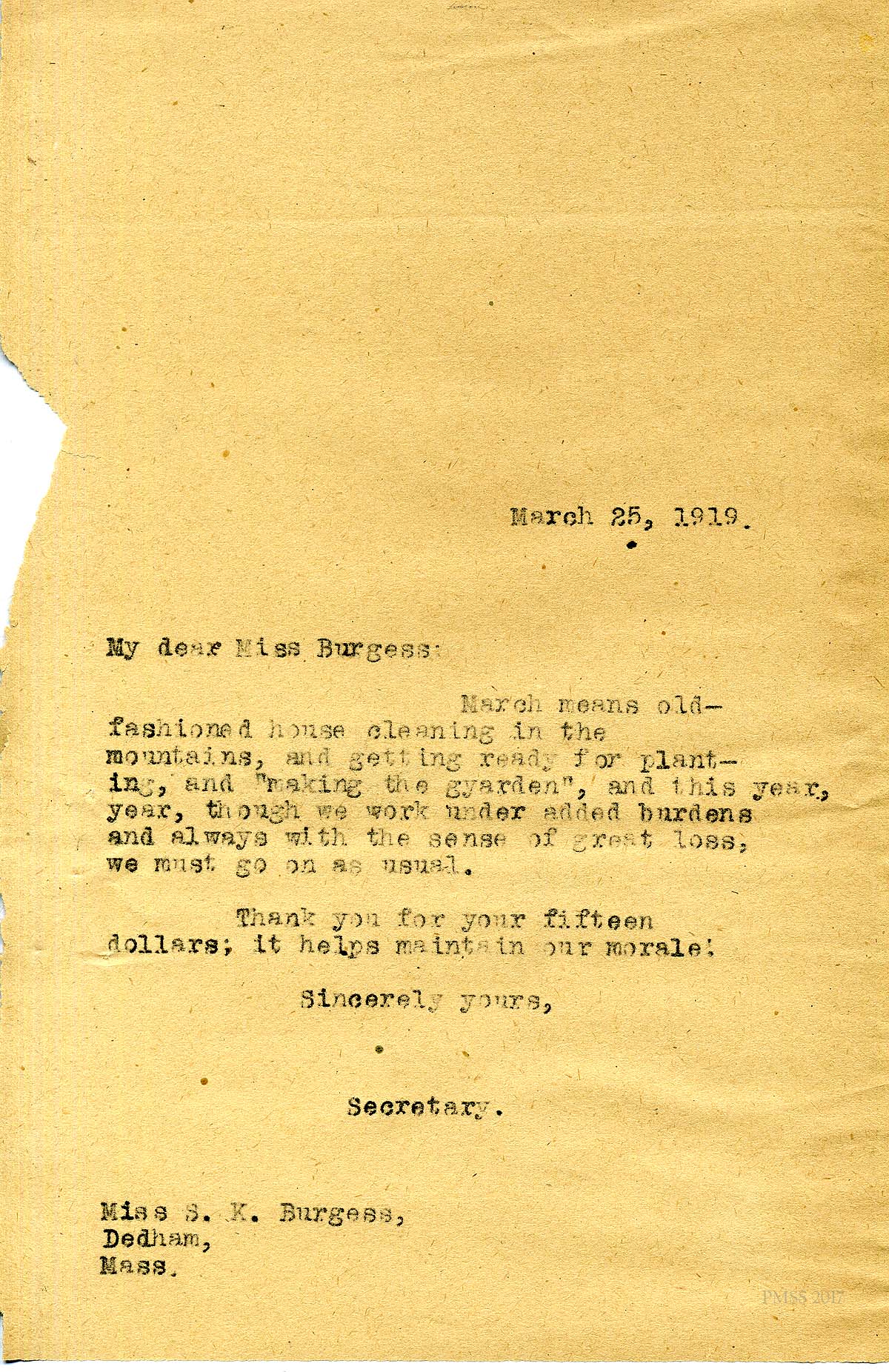 1919 March 25 To Miss S. K. Burgess, Dedham, Mass., from PMSS thanking her for her recent donation to the school “…it helps maintain our moral…” after the loss of the Burkham School House I.