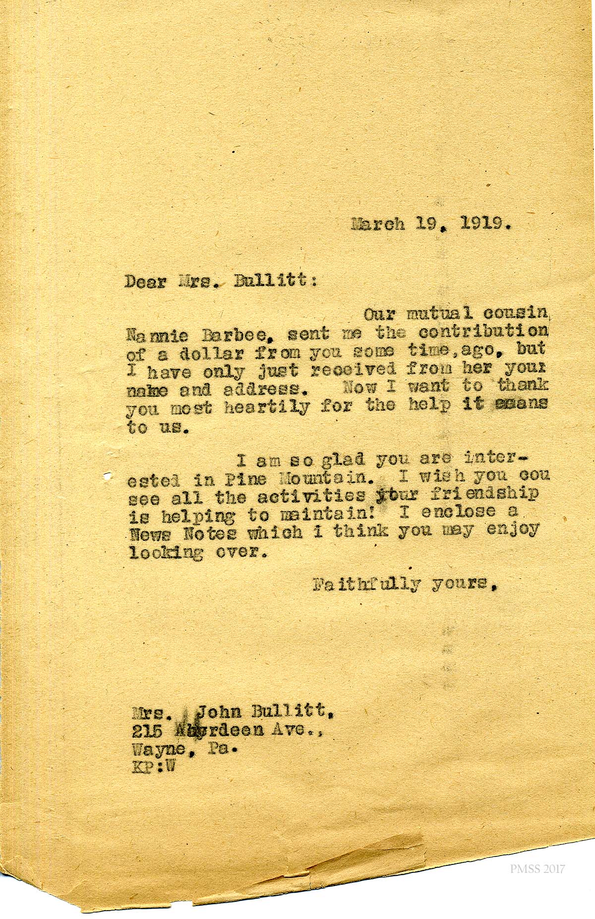 1919 March 19 To Mrs. John Bullitt, 215 Aberdeen Ave., Wayne, PA, from Katherine Pettit. Pettit notes, “Our mutual cousin Nannie Barbee, sent me the contribution of a dollar from you some time ago, but I have only just received from her your name and address…” Thanks her for donation.