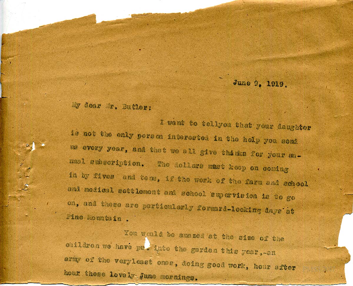 1919 June 9 [fragment] To Mr. Butler [John Butler, father of Marguerite Butler, staff] from PMSS. Thanking him for donation to School. Notes that “You would be amazed at the size of the children we have put into the garden this year, — an army of the very least ones, doing good work, hour after hour these lovely June mornings …”
