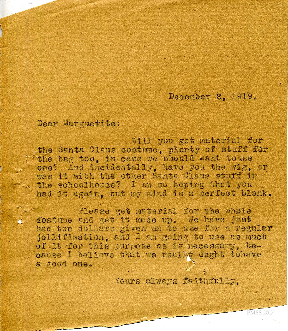 1919 December 2 To Marguerite [Marguerite Butler, staff] from Katherine Pettit [?] asking her “Will you get material for the Santa Claus costume, plenty of stuff for the bag too, in case we should want to use one? And incidentally, have you the wig, or was it with the other Santa Claus stuff in the schoolhouse? I am so hoping that you had it again, but my mind is a perfect blank. Please get material for the whole costume and get it made up. We have just had ten dollars given us to use for a regular jollification, and I am going to use as much of it for this purpose as is necessary because I believe that we really ought to have a good one.”