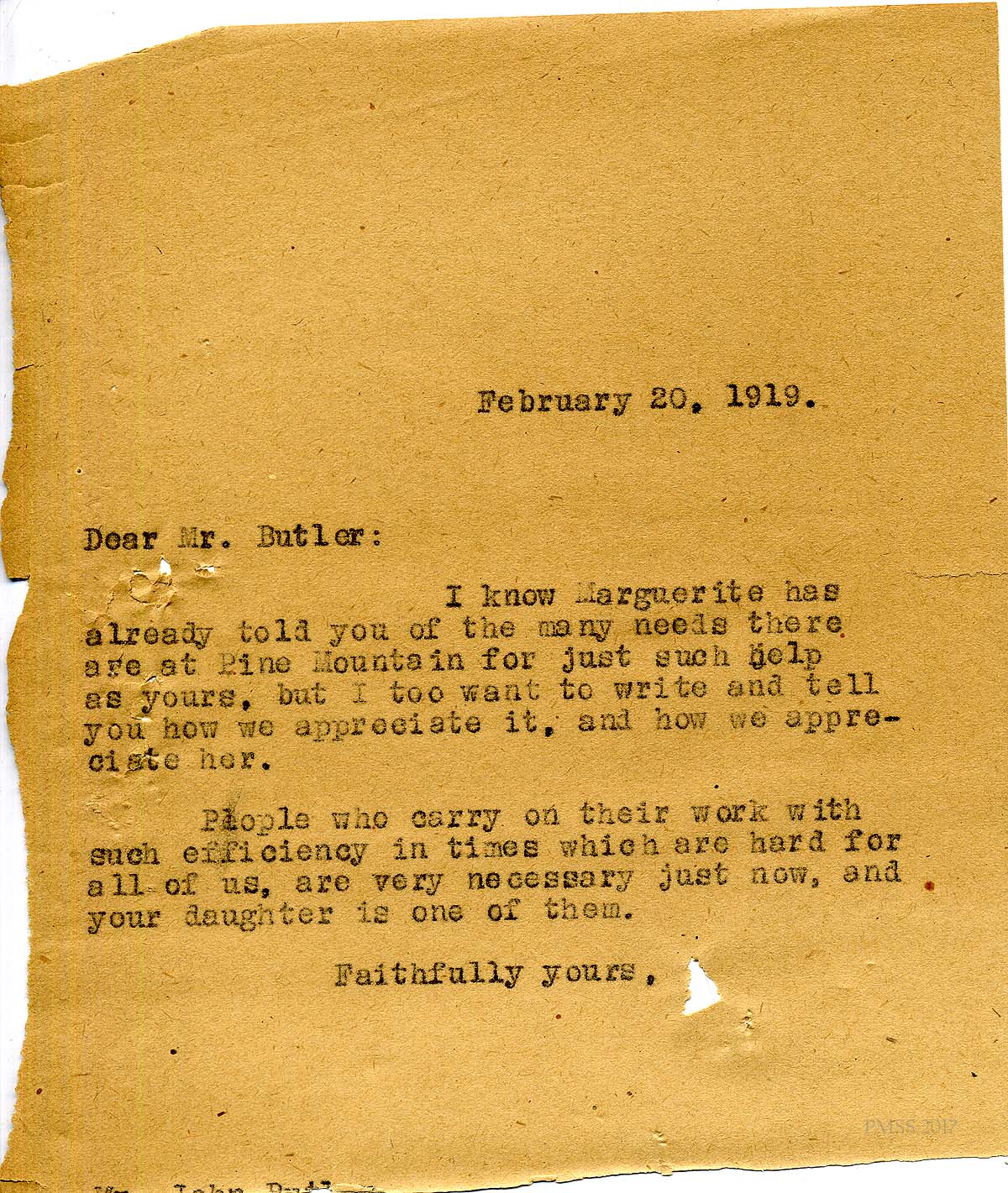 1919 February 20 To Mr. Butler [John Butler? father of Marguerite Butler, staff at PMSS] from KP [?]. Notes how much the School appreciates his daughter and thanking him for his support. “People who carry on their work with such efficiency in times which are hard for all of us, are very necessary just now, and you daughter is one of them…”