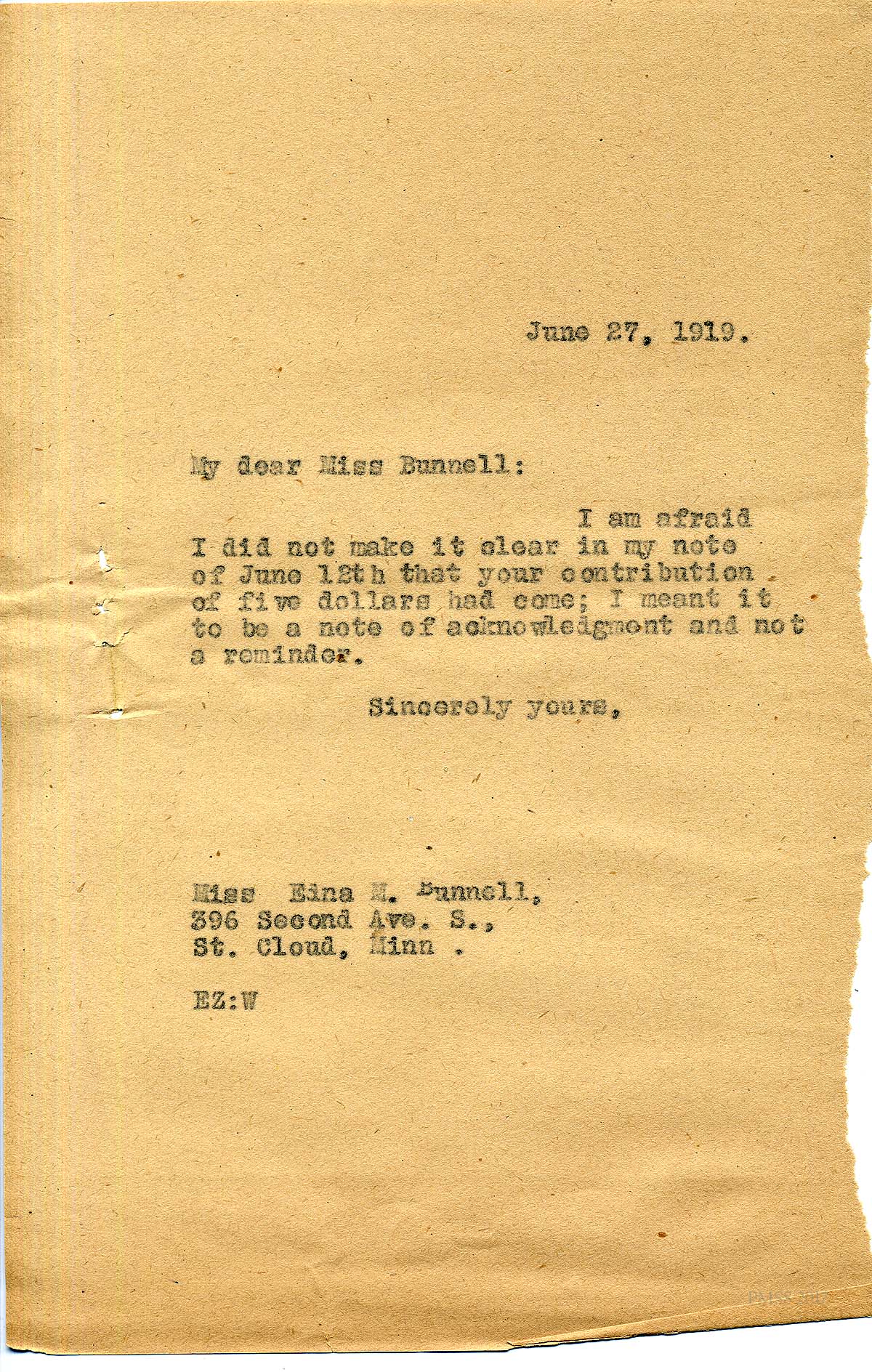 1919 June 27 To Miss Eina M. Bunnell, 396 Second Ave, S., St. Cloud, Minn., from Ethel Zande. Apology for earlier note regarding her donation.