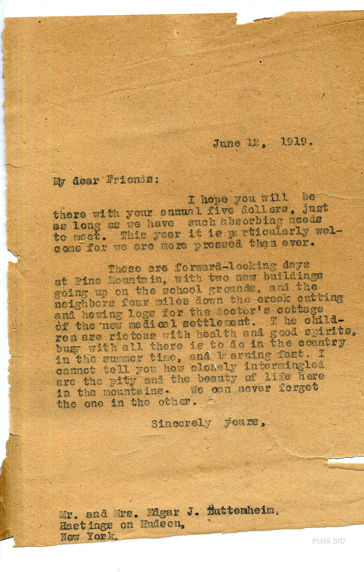 1919 June 12 To Mr. and Mrs Edgar J. Buttenheim, Hastings on Hudson, New York, from Ethel Zande [?]. Reminds donors of the annual subscription. Repeats the sentiment: “”The pity and the beauty of life in the mountains is strangely mixed so that we can never forget the one in the other.”