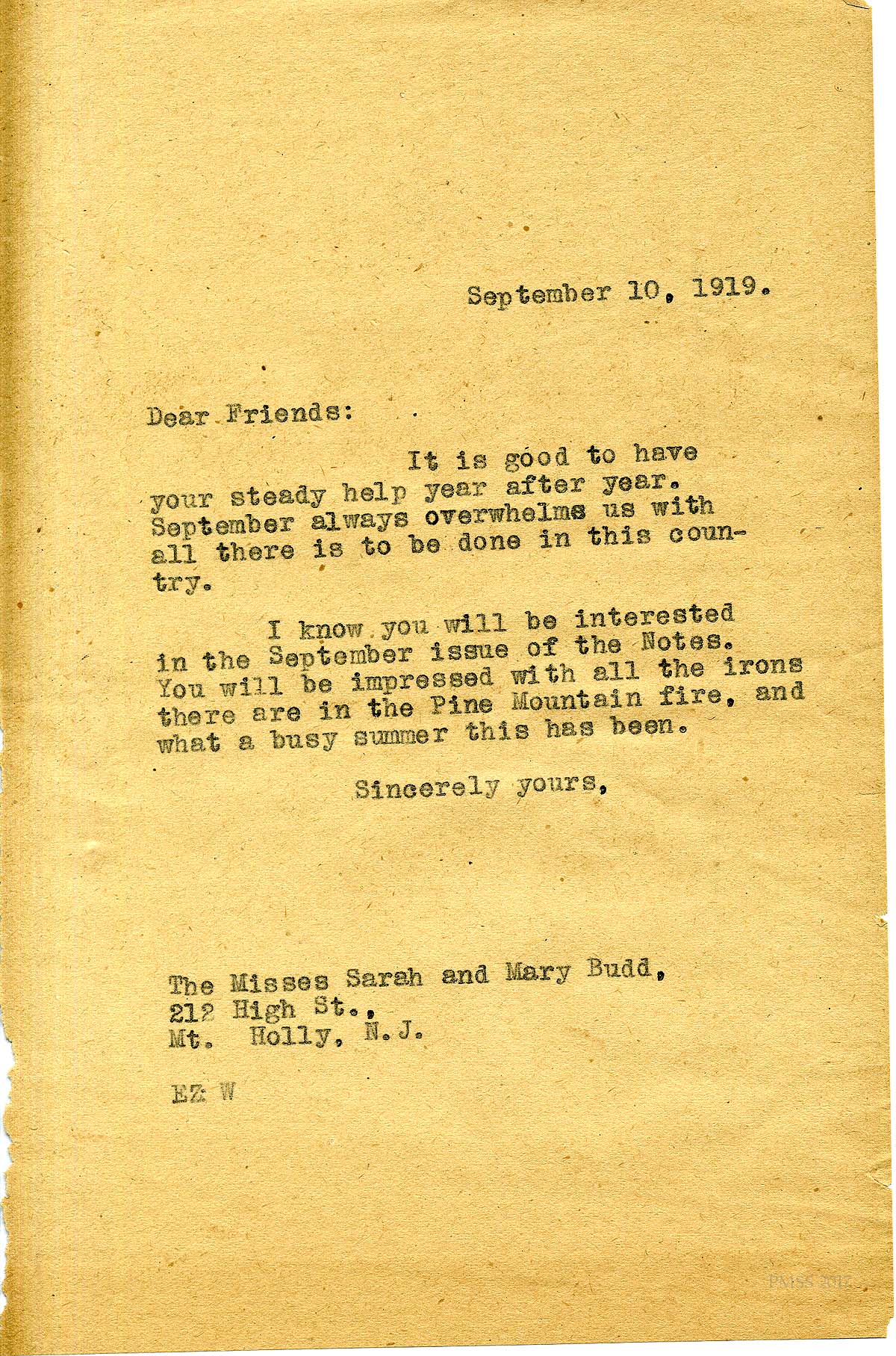 TAGS: Administration General Correspondence by Year 1919 general correspondence, Ethel de Long Zande, Katherine Pettit, Burkham Memorial School House I fire, fires, Leon Deschamps, Perfect Acre, Luigi Zande, Alberto Zande, Miss V.W. Buffum, Mrs. Waller Bullock, hiking, Big Black Mountain, Wildflower Weekend