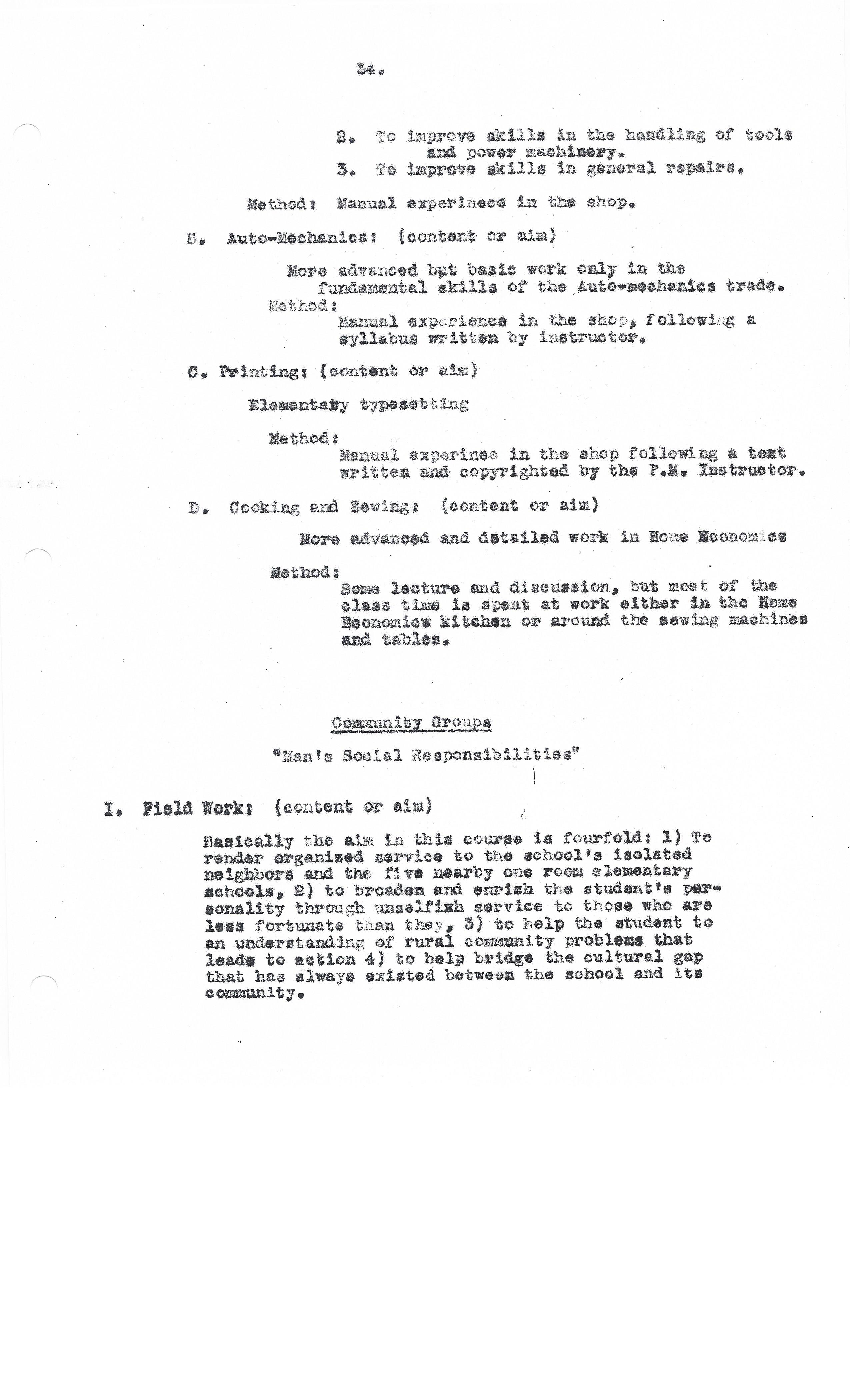 To make the student personally familiar with some of the ways in which man uses his puny strength to advantage and gets things done; to give him a sympathetic feeling for other life about him — plant, animal and human — and his responsibility to help make the mutual dependence a mutually helpful and constructive relationship; to give him enough personal experience of the workings of cause and effect so that he will want to use his intelligence to seek and handle causes and will not get upset over effects nor fall back on magic for controls.