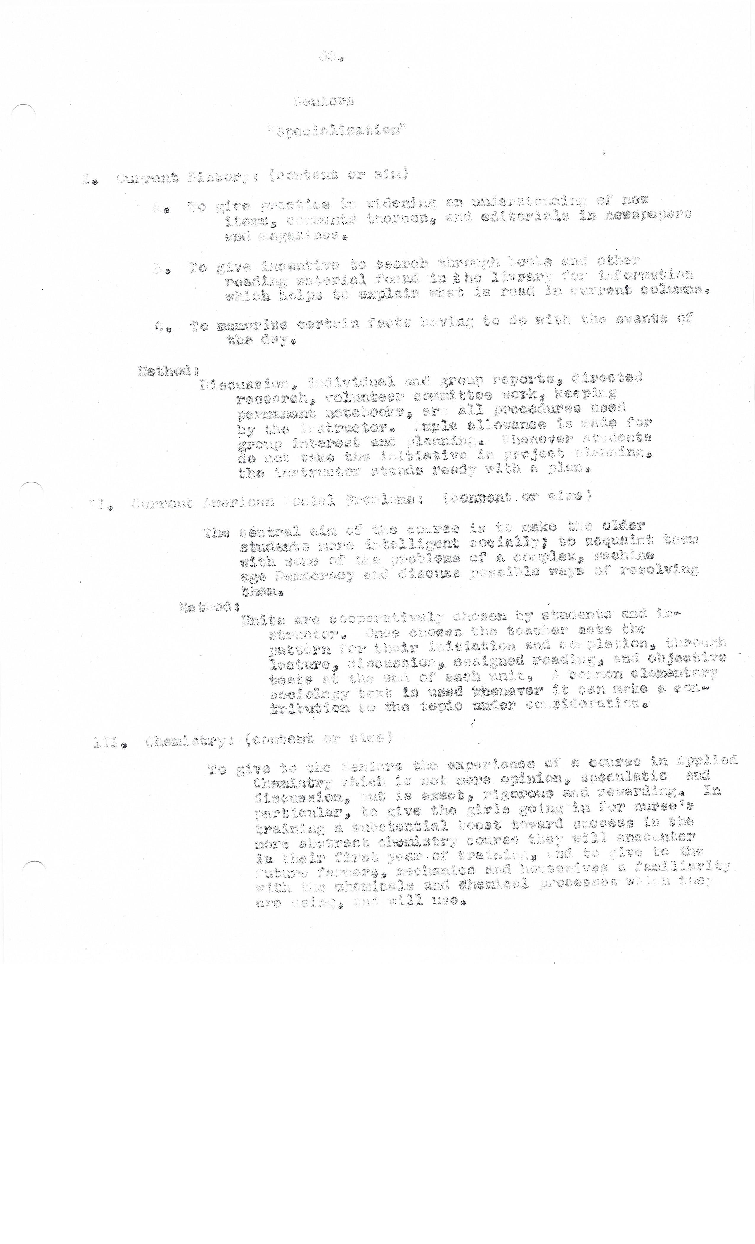 The class period is devoted either to discussion or research in the library. Each student is required to have ready at class time at least three brief reports to be given orally on current happenings and to raise a question of interest in one of these for discussion. Each student is given an opportunity during the second term to pursue independently one phase of American History that interests him most for a period of six weeks and write a paper based on his readings.