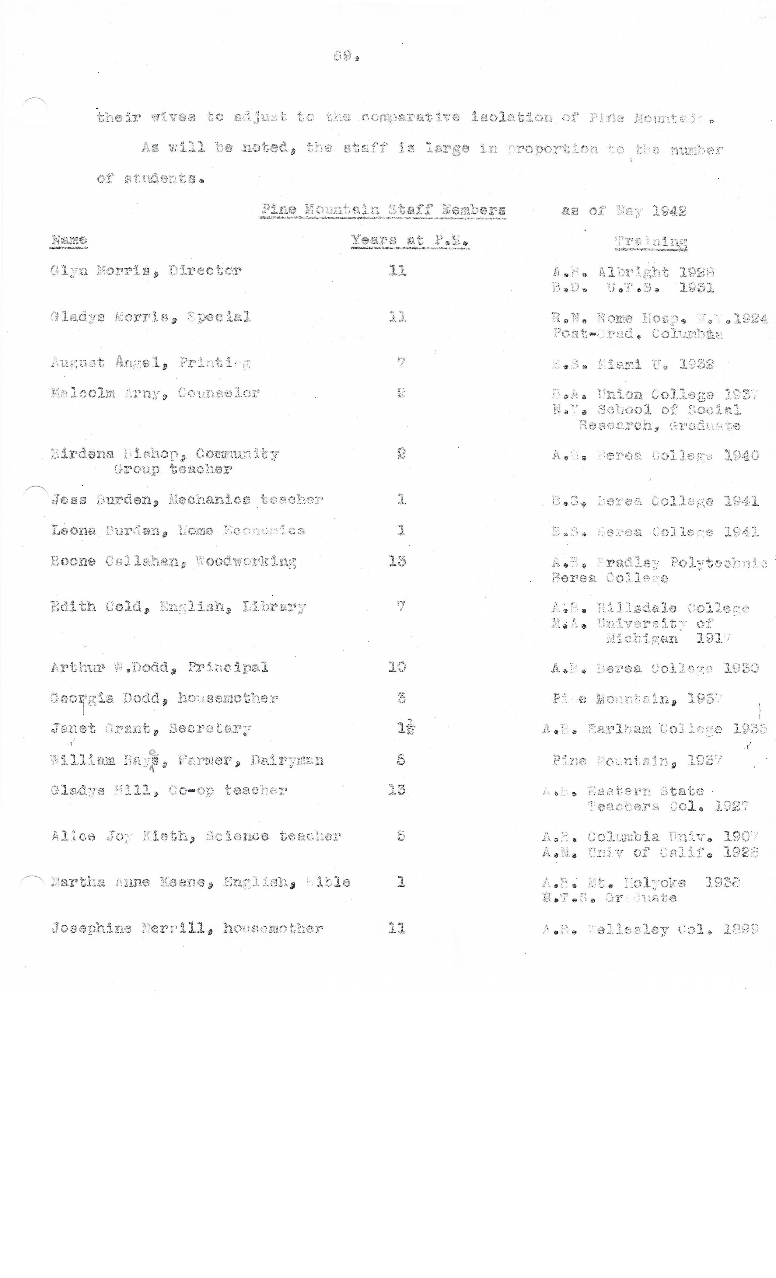 TAGS: Glyn Morris 1942 Study and Recommendations VI Personnel, Pine Mountain Settlement School, institutional reports, institutional management, institutional history, staff, teachers, doctors, nurses, personnel turnover, hiring, training, administrators, counselors, housemothers, secretaries, farmers, dieticians, bookkeepers, publicity representatives
