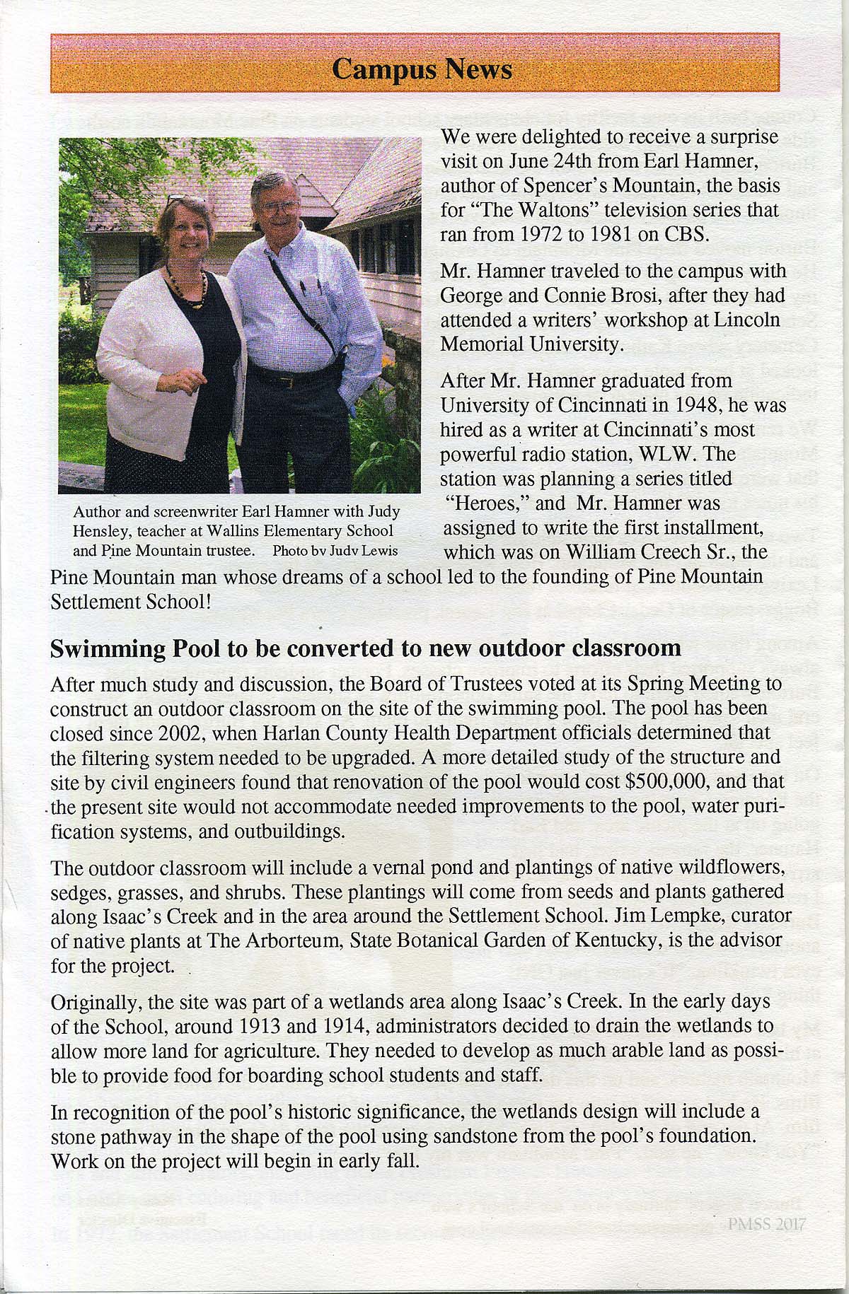 [Color photograph: “Author and screenwriter Earl Hamner with Judy Hensley, teacher at Wallins Elementary School and Pine Mountain trustee. Photo by Judy Lewis“]