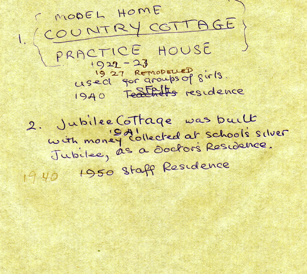 A handwritten note from 1940 indicates that the cottage was built with money collected at the School’s Silver Jubilee of 1938 and was built first as a doctor’s residence and used later (1950) as a residence for staff members.A progress report of the cottage’s construction was present to the Board of Trustees, c. 1940, by Director Glyn Morris: