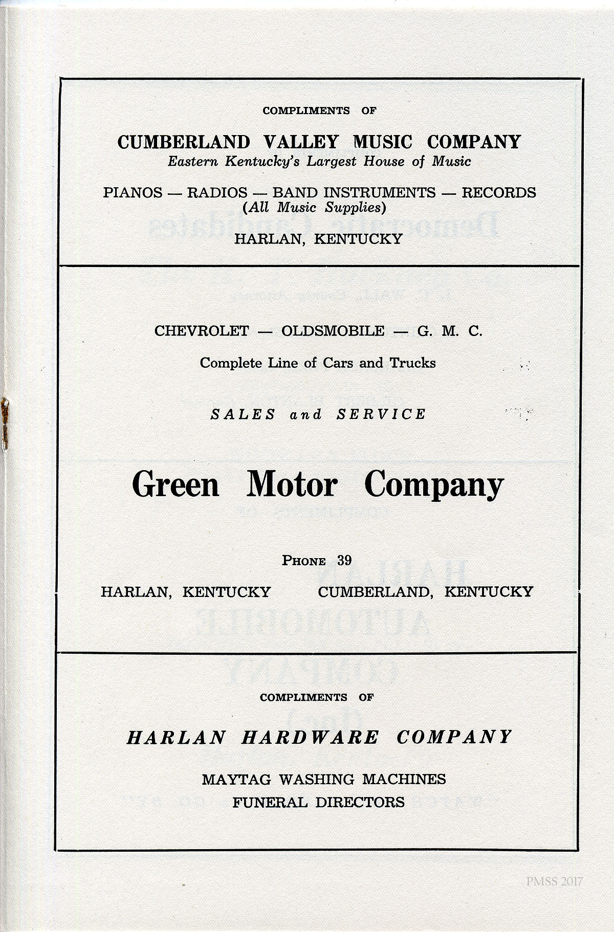 [024] Advertisements: Cumberland Valley Music Company (Harlan), Green Motor Company (Harlan and Cumberland), and Harlan Hardware Company (“Maytag Washing Machines, Funeral Directors”).