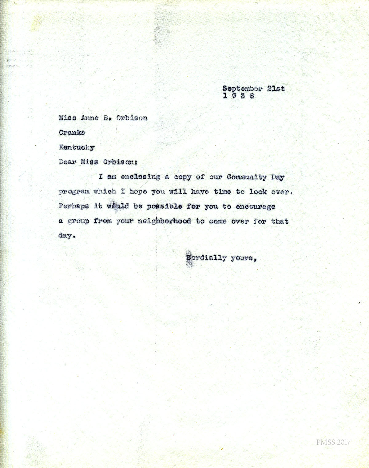 [006] September 21, 1938. To Miss Anne B. Orbison, Cranks, KY, from [unsigned], sending her a copy of the Community Day program for her review. He suggests she “encourage a group from your neighborhood to come over for that day.”