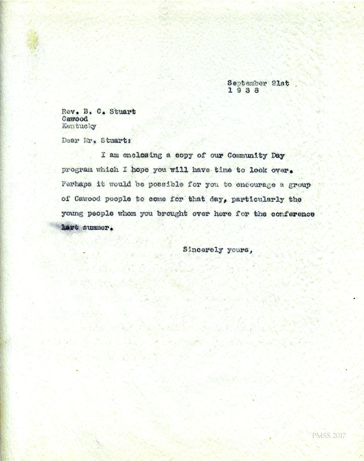 [005] September 26, 1938. To Rev. Mark Andrews, apparently Morris], who is sending preliminary announcements of the Community Day for his review.