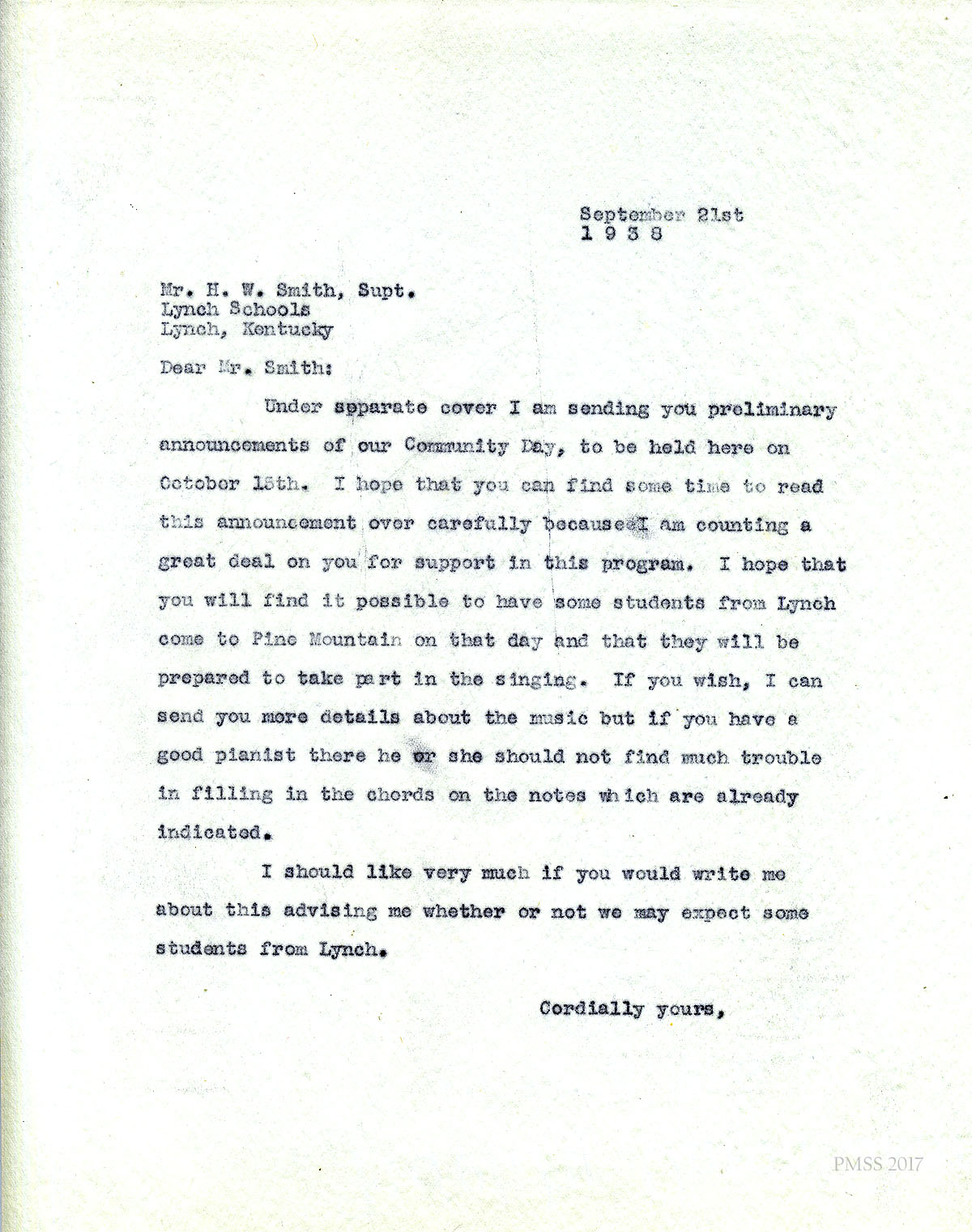 [014] October 1, 1938. To Glyn Morris from L.C. Henderson, Supt, Harlan City Schools, who distributed the Pine Mountain Community Day letter and information to “people that we thought would be most likely to attend.” He explains that his faculty members will be otherwise engaged at the time.