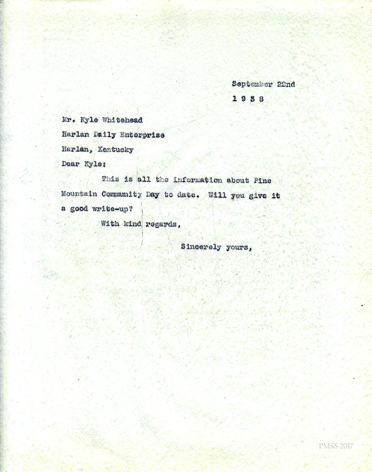 [010] September 22, 1938. To Kyle Whitehead, Harlan Daily Enterprise, from [unsigned], enclosing information about Pine Mountain Community Day. “Will you give it a good write-up?”