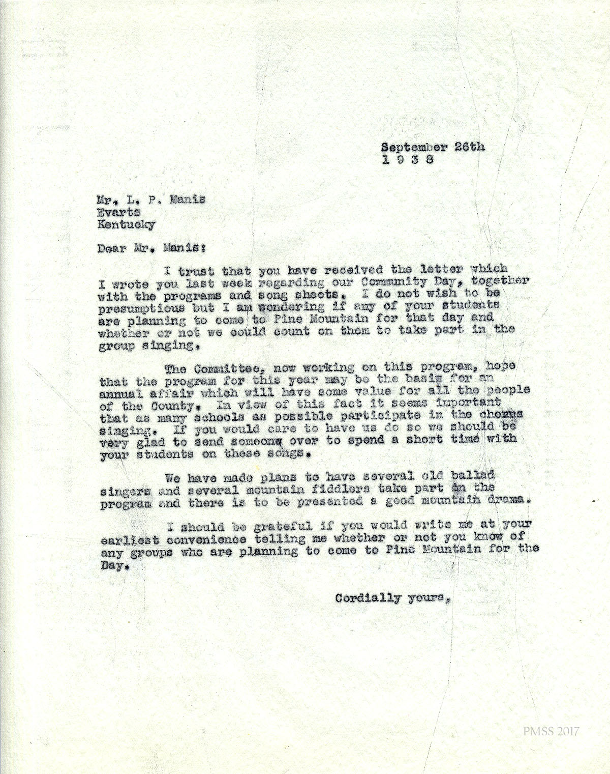 [004] September 26, 1938. To Wm. Nolan, Mary Dell, KY, from [unsigned] inviting him to sing ballads at the PMSS Fair Day; PMSS will pay for his transportation.