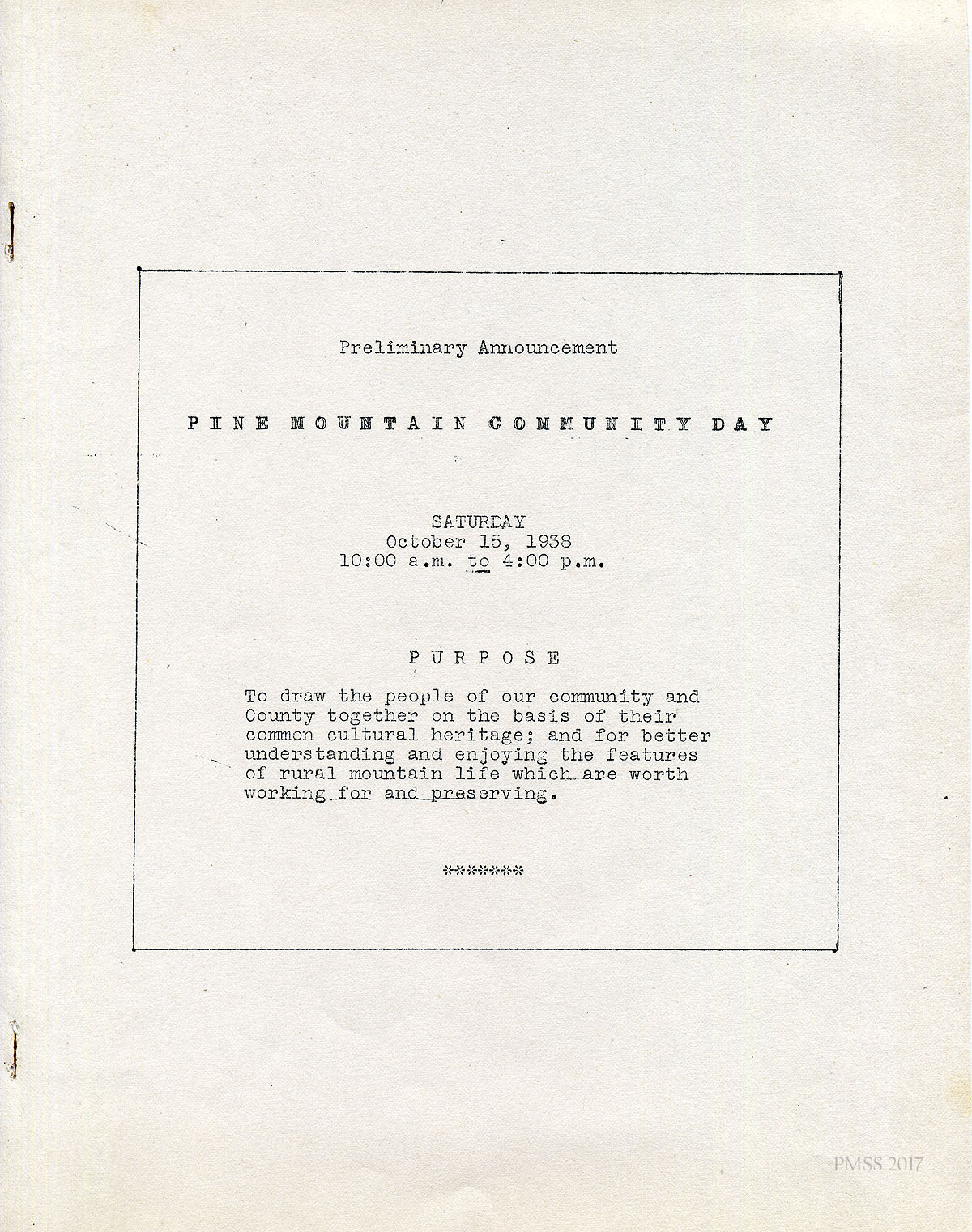 [015] “Preliminary Announcement. PINE MOUNTAIN COMMUNITY DAY. Saturday, October 15, 1938, 10:00 a.m. to 4:00 p.m. PURPOSE: To draw the people of our community and County together on the basis of their common cultural heritage; and for better understanding and enjoying the features of rural mountain life which are worth working for and preserving.”