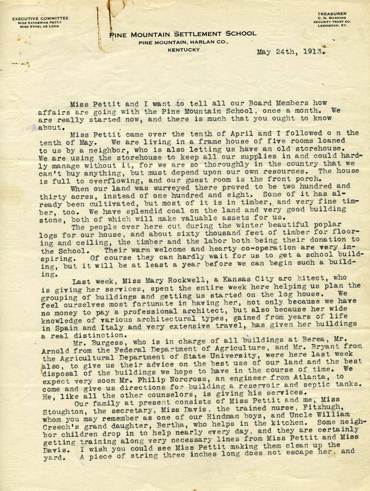 The year 1913 was the opening chapter of Pine Mountain Settlement School. In the Directors Annual Reports to BOT 1913, many references to the planning and the vision of the Directors Katherine Pettit and Ethel de Long and the physical construction of the settlement may be found.