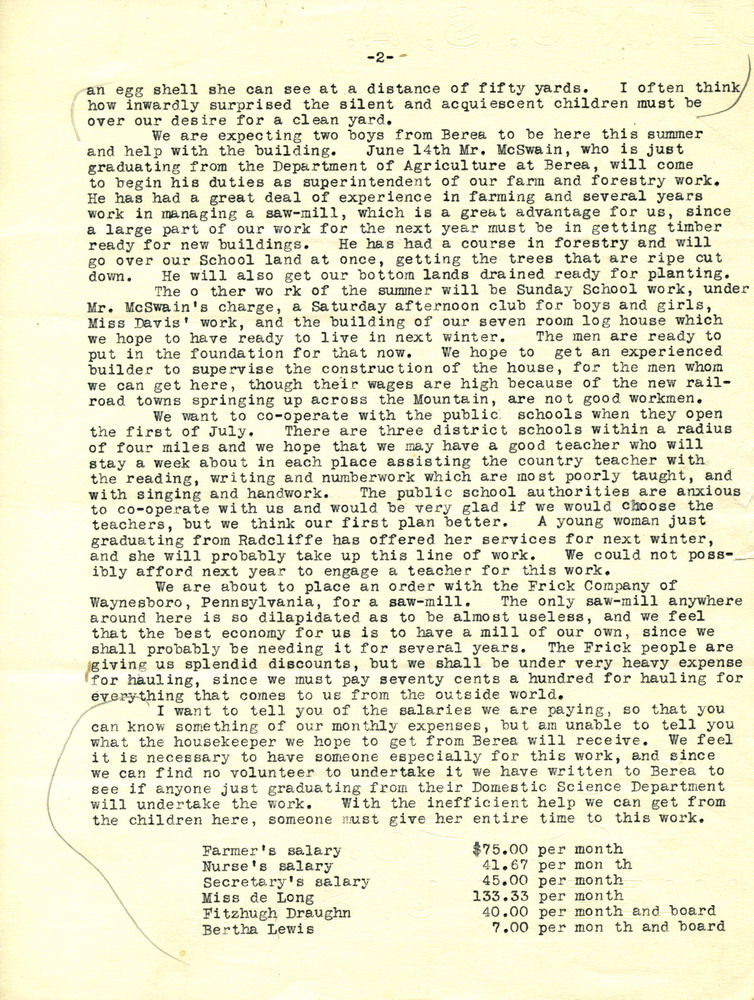 I want to tell you of the salaries we are paying, so that you can know something of our monthly expenses, but am unable to tell you what the housekeeper we hope to get from Berea will receive. We feel it is necessary to have someone especially for this work, and since we can find no volunteer to undertake it we have written to Berea to see if anyone just graduating from their Domestic Science Department will undertake the work. With the inefficient help we can get from the children here, someone must give her entire time to this work.