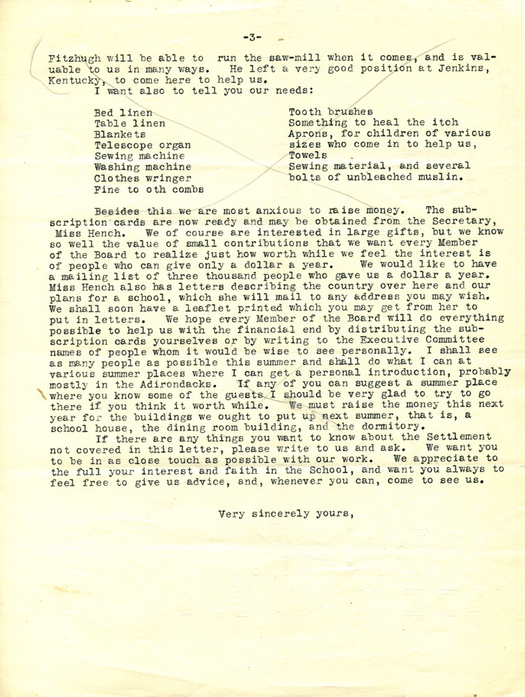 Besides this we are most anxious to raise money. The subscription cards are now ready and may be obtained from the Secretary, Miss [Elizabeth] Hench We of course are interested in large gifts, but we know so well the value of small contributions that we want every Member of the Board to realize just how worthwhile we feel the interest is of people who can give only a dollar a year. We would like to have a mailing list of three thousand people who gave us a dollar a year. Miss Hench also has letters describing the country over here and our plans for a school, which she will mail to any address you may wish. We shall soon have a leaflet printed which you may get from her to put in letters. We hope every Member of the Board will do everything possible to help us with the financial end by distributing the subscription cards yourselves or by writing to the Executive Committee names of people whom it would be wise to see personally. I shall see as many people as possible this summer and shall do what I can at various summer places where I can get a personal introduction, probably mostly in the Adirondacks. If any of you can suggest a summer place where you know some of the guests I should be very glad to try to go there if you think it worthwhile. We must raise the money this next year for the buildings we ought to put up next summer, that is, a school house, the dining room building, and the dormitory.