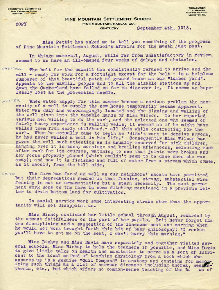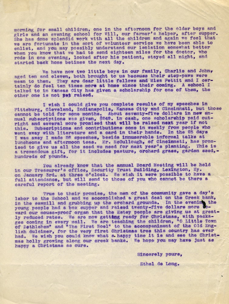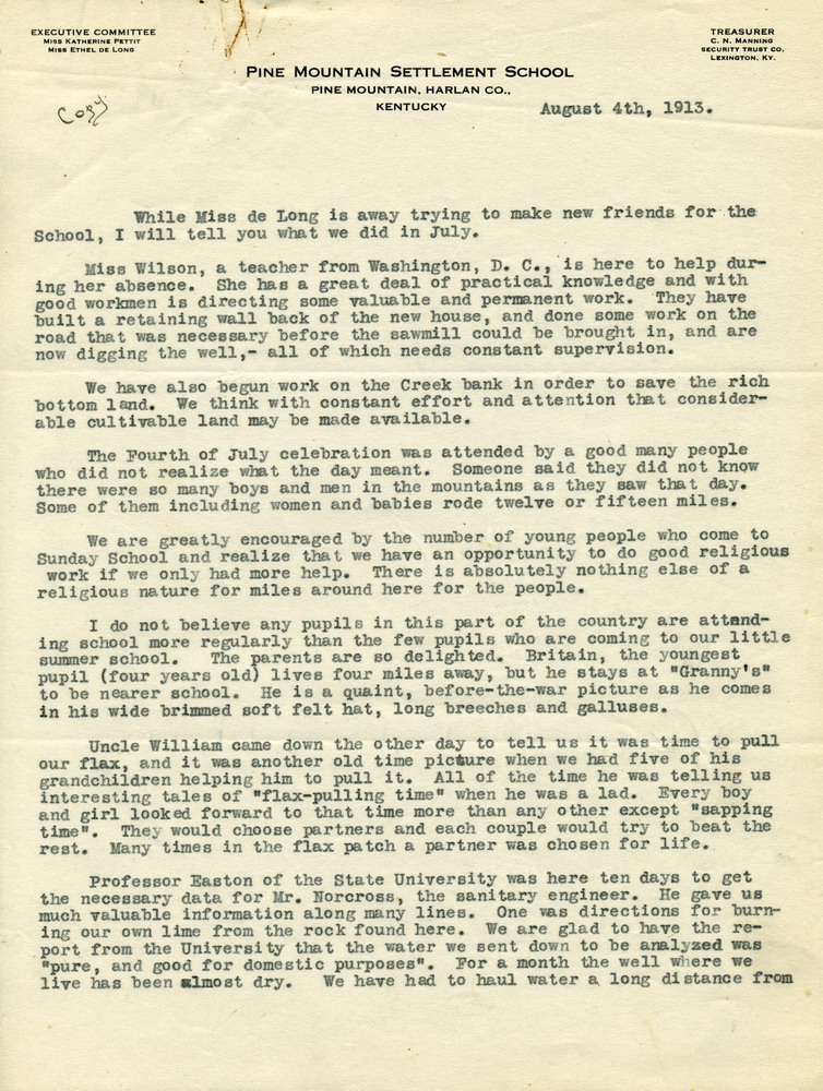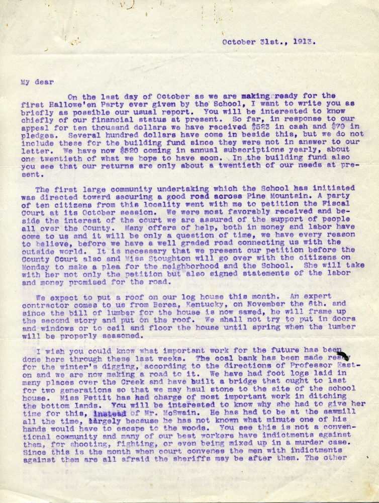 The first large community undertaking which the School has initiated was directed toward securing a good road across Pine Mountain. A party of ten citizens from this locality went with me to petition the Fiscal Court at its October session. We were most favorably received and beside the interest of the court we are assured of the support of people all over the County. Many offers of help, both in money and labor have come to us and it will be only a question of time, we have every reason to believe, before we have a well graded road connecting us with the outside world. It is necessary that we present our petition before the County Court also and Miss Stoughton will go over with the citizens on Monday to make a plea for the neighborhood and the School. She will take with her not only the petition but also signed statements of the labor and money promised for the road.