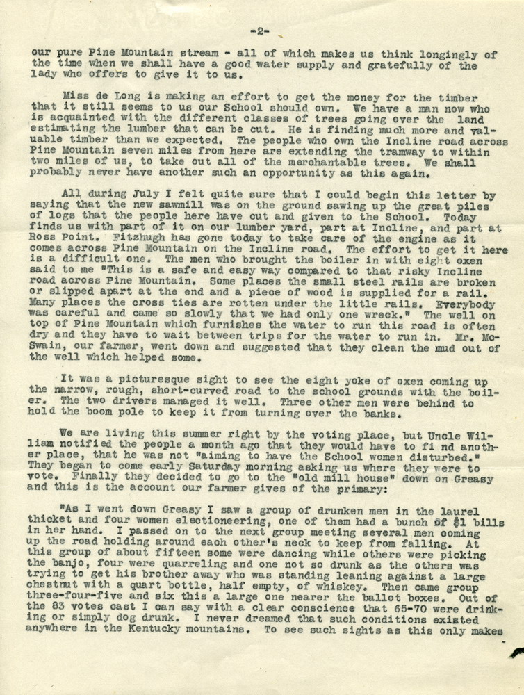 I wish you could know what important work for the future has been done here through these last weeks. The coal bank has been made ready for the winter’s digging, according to the directions of Professor Easton and we are now making a road to it. We have had foot logs laid in many places over the Creek and have built a bridge that ought to last for two generations so that we may haul stone to the site of the school house. Miss Pettit has had charge of most important work in ditching the bottom lands. You will be interested to know why she had to give her time for this, instead of Mr. McSwain. He has had to be at the sawmill all the time, largely because he has not known what minute one of his hands would have to escape to the woods. You see this is not a conventional community and many of our best workers have indictments against them, for shooting, fighting, or even being mixed up in a murder case. Since this is the month when court convenes the men with indictments against them are all afraid the sheriffs may be after them. The other …