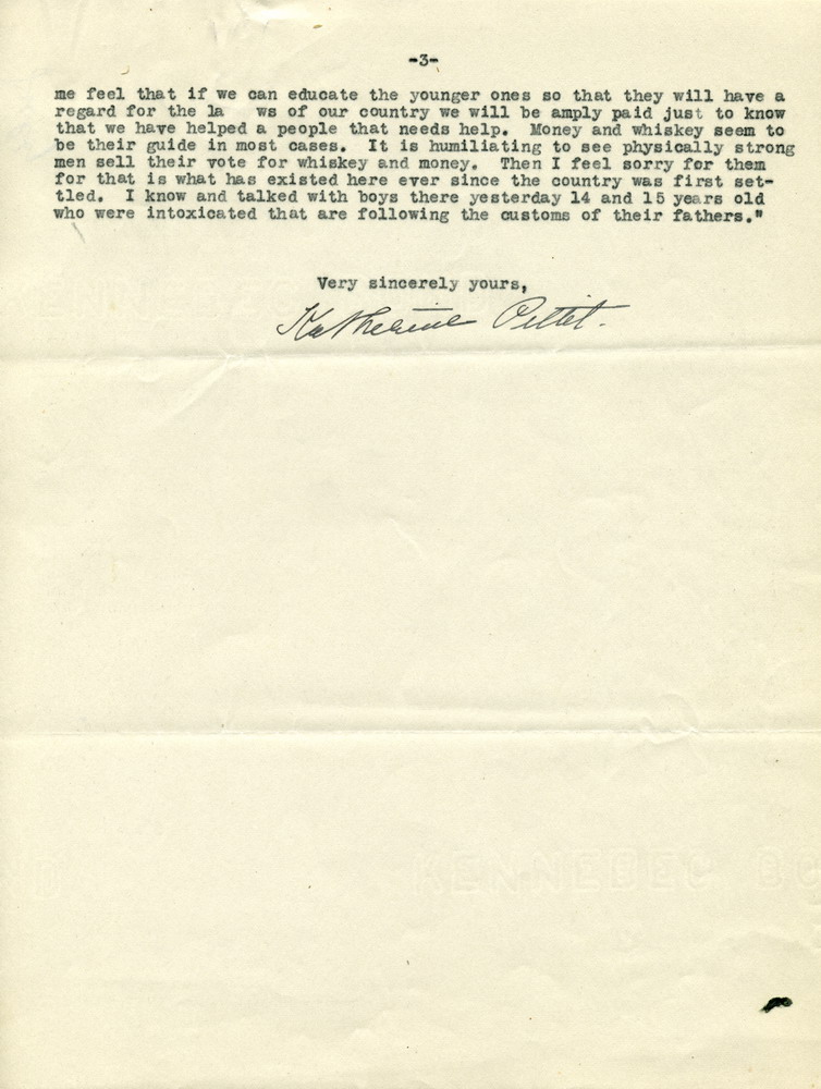 …me feel that if we can educate the younger ones so that they will have a regard for the laws of our country we will be amply paid just to know that we have helped a people that needs help. Money and whiskey seem to be their guide in most cases. It is humiliating to see physically strong men sell their vote for whiskey and money. Then I feel sorry for them for that is what has existed here ever since the country was first settled. I know and talked with boys there yesterday, 14 and 15 years old who were intoxicated, that are following the customs of their fathers.”