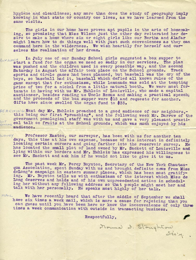 Professor Easton of the State University was here ten days to get the necessary data forMr. [Philip] Norcross, the sanitary engineer. He gave us much valuable information along many lines. One was directions for burning our own lime from the rock found here. We are glad to have the report from the University that the water we sent down to be analyzed was “pure, and good for domestic purposes”. For a month the well where we live has been almost dry. We have had to haul water a long distance from…
