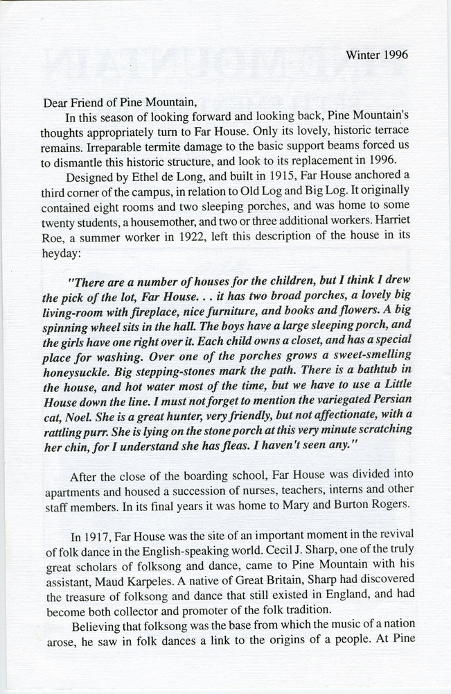 ‘Pine Mountain, Sharp said, should be the friendly soil in which all that belonged to us should be kept alive, and all the allied English songs and dances should be planted — a center for English and American folklore.” Over the years, this vision found expression in such things as the May Day celebration, the Ballad Book, tour groups from the school, dancing classes and parties. It still finds expression whenever a group, be it Elder Hostel, a visiting elementary school class, a reunion of alumni and friends, or young people from the neighborhood takes the floor at Laurel House or gathers by the fireplace to sing. It is a living thread in the fabric of Pine Mountain. It is fitting that the historic terrace has been preserved and will be a part of the new Far House.’ **