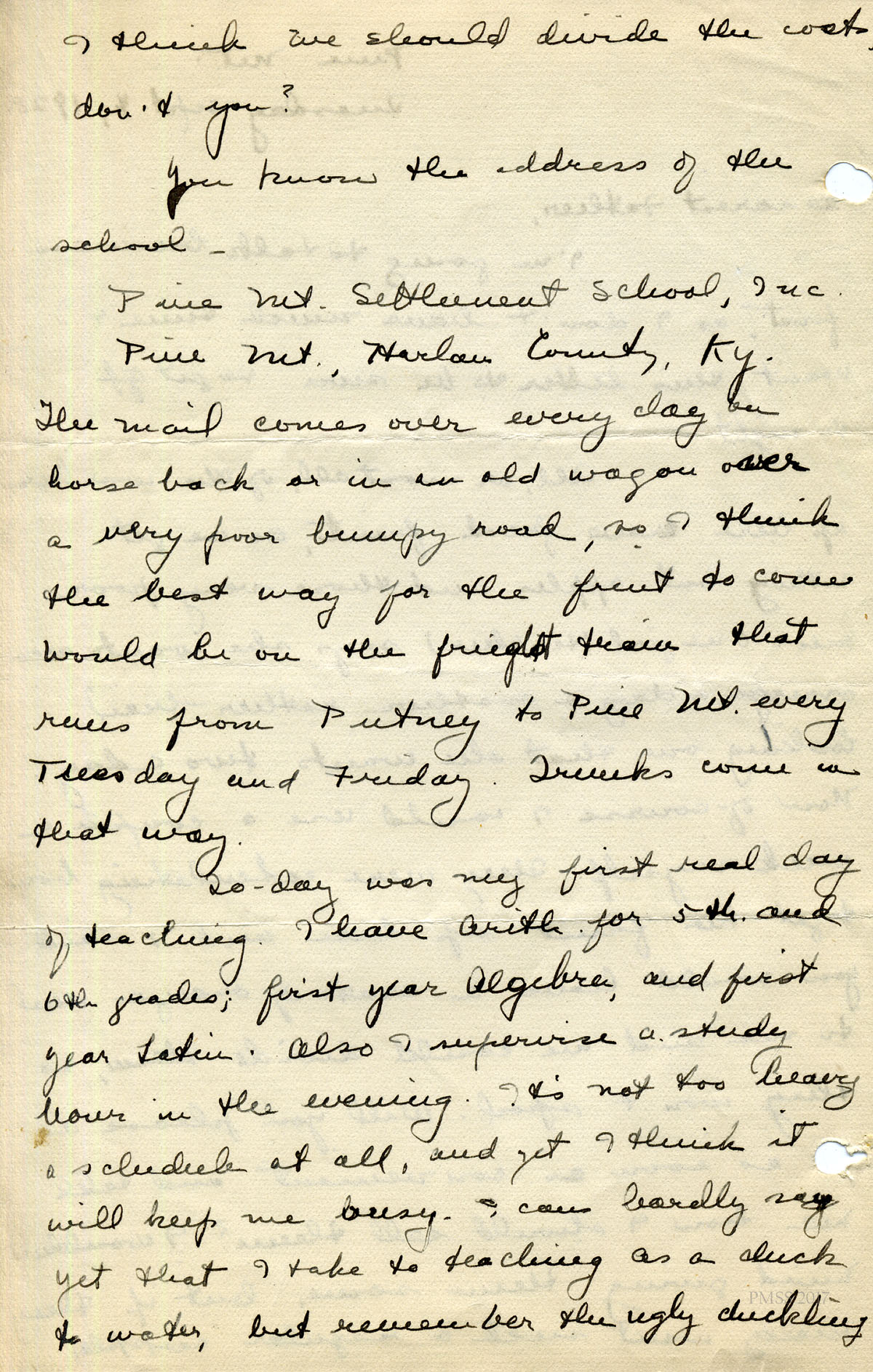 In the summer of 2017 John Orndorff, Harriet Crutchfield’s son, visited Pine Mountain Settlement School and brought along the following “journal” comprised of letters his mother, Harriet, wrote to family and friends during her time as a teacher at Pine Mountain Settlement School. Over 200 pages of Harriet’s observations, reflections, and experiences fill the small black binder. Her son noted when talking with the staff at Pine Mountain that he could think of no better place for the journal to be appreciated. His generosity and his astute assessment of the journal’s importance to Pine Mountain Settlement are profoundly appreciated.