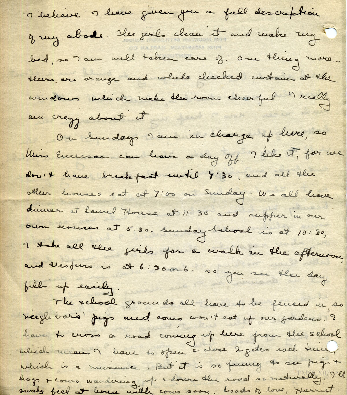 Harriet’s “journal” — the compilation of her letters to her family and friends — chronicles a close and often very personal view of a first-comer to Pine Mountain Settlement School. Her letters track her adaptation to the values, lifestyle, and relationships during the early years of the settlement institution, just following the death of co-founder Ethel de Long Zande. The letters are crammed with observations of people, schedules, the beauty of the mountains, the language, and especially the food. Her letters provide microscopic details that many of her colleagues failed to record or notice. While the time-span of the letters, only 1928 to 1930, is short, her account is the next best thing to being there and her enthusiasm is infectious.