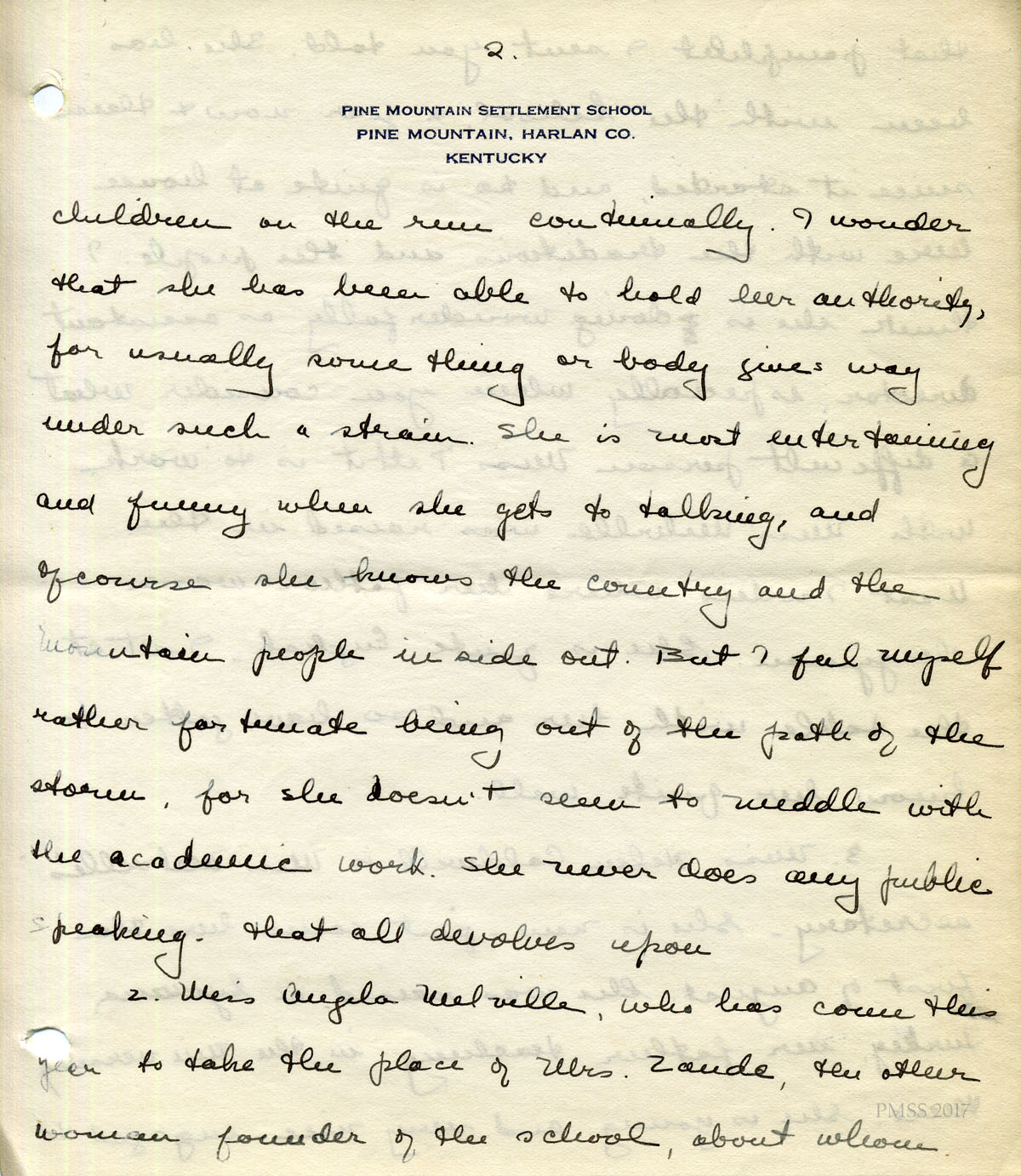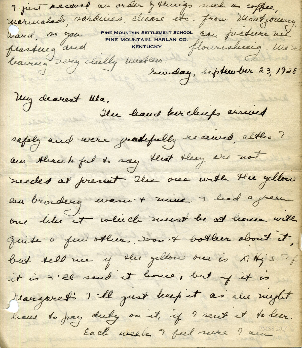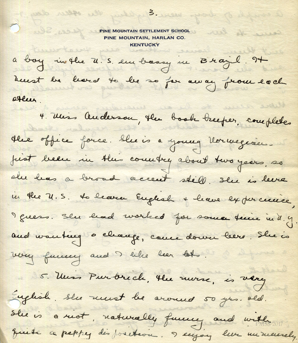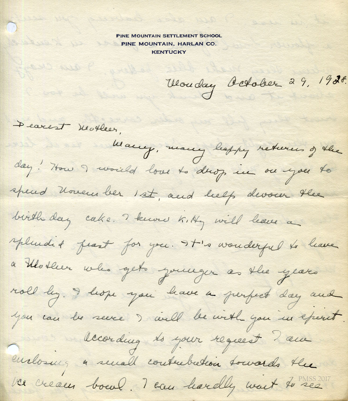 In the summer of 2017 John Orndorff, Harriet Crutchfield’s son, visited Pine Mountain Settlement School and brought along the following “journal” comprised of letters his mother, Harriet, wrote to family and friends during her time as a teacher at Pine Mountain Settlement School. Over 200 pages of Harriet’s observations, reflections, and experiences fill the small black binder. Her son noted when talking with the staff at Pine Mountain that he could think of no better place for the journal to be appreciated. His generosity and his astute assessment of the journal’s importance to Pine Mountain Settlement are profoundly appreciated.