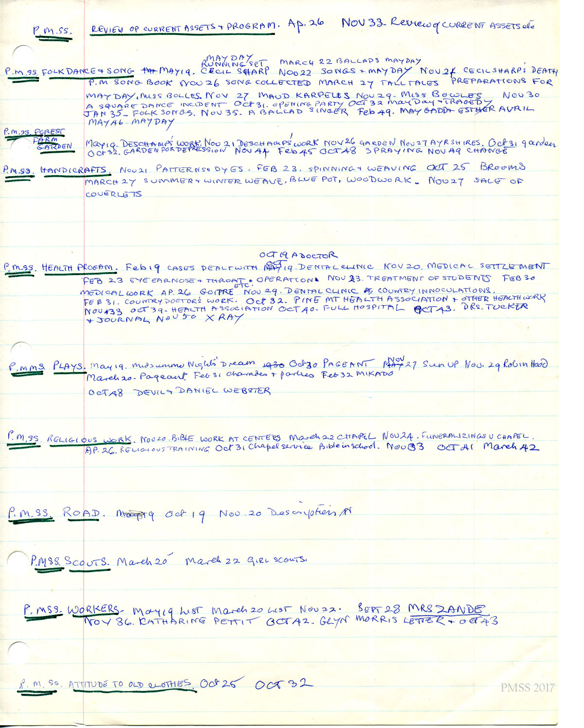 PMSS Religious Work | Nov ’20 Bible work at Centers March ’22 Chapel Nov ’24 Funeralizing in Chapel April ’26 Religious training Oct ’31 Chapel service. Bible in school Nov ’33 Oct ’41 March ’42 |