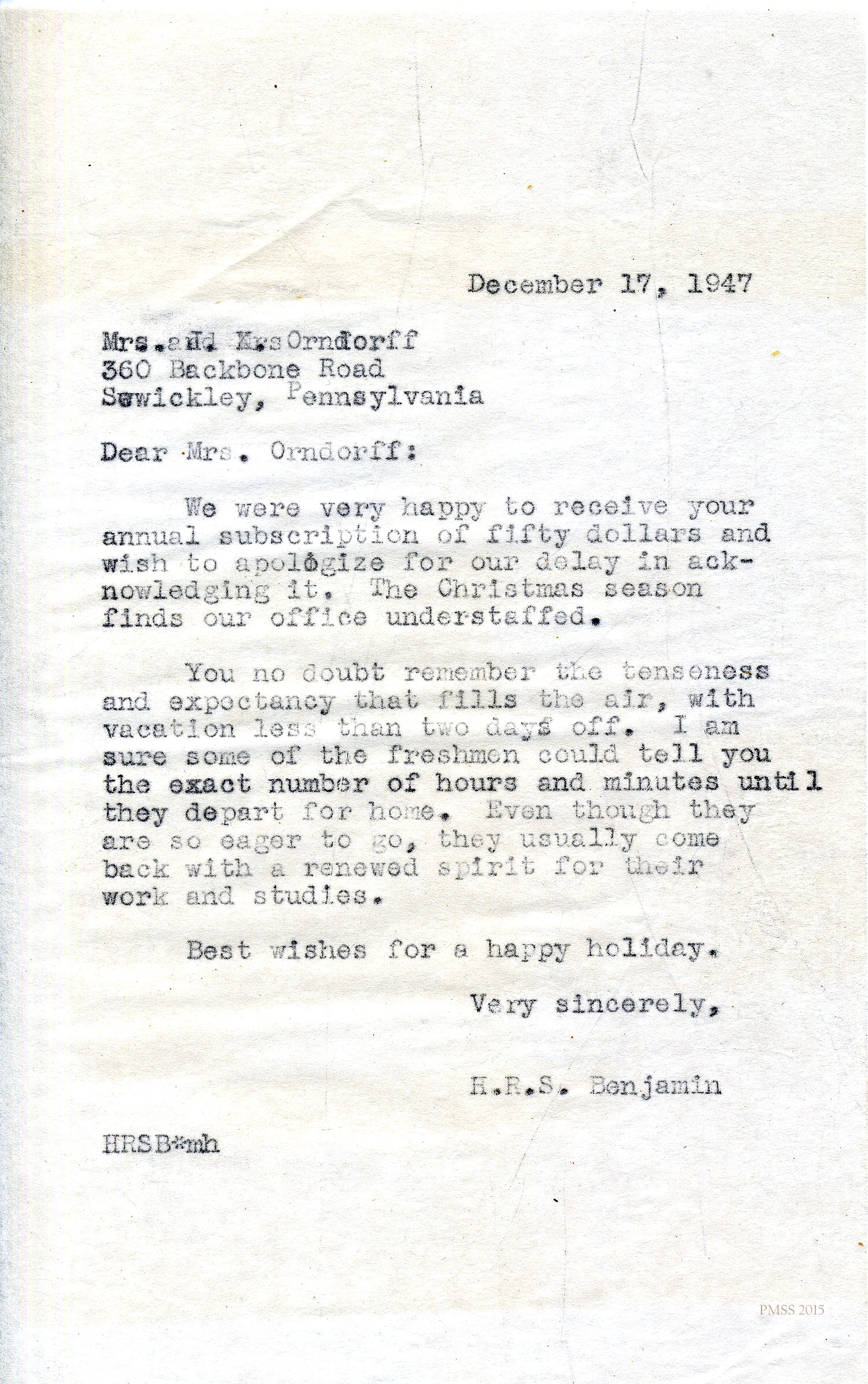 December 17, 1947 [half-page]. H.R.S. Benjamin to Mrs. John K. Orndorff (Harriet Crutchfield), Sewickley, PA. Thanks her for annual subscription; students’ anticipation of vacation. [028]