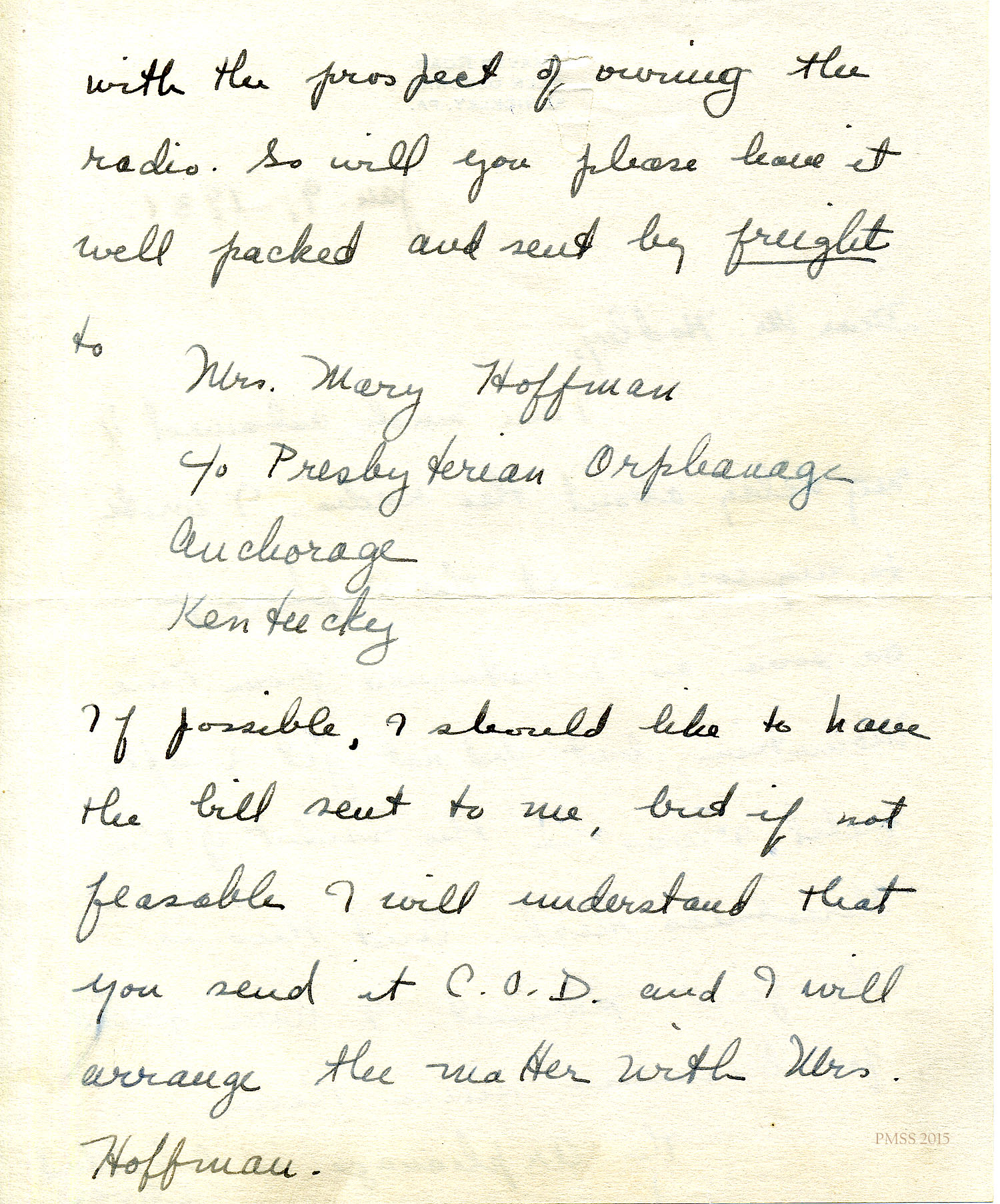 Your letter was received too late for us to get the radio packed and away last week. However, it is well-packed and is going forward today by way of log train and then by prepaid express to Mary Hoffman, In care of the Presbyterian Orphanage, Anchorage, Kentucky. I know the people at Anchorage will be delighted to have so valuable a set and it is easy to believe that continued enjoyment can only be the result from it. I know you thoroughly understand that while it was a case of keen disappointment to Pine Mountain to be unable to use your gift, we were acting in the best interest of everyone when we felt it necessary to tell you that the expense of making the change would be so great that it seemed futile to attempt it.