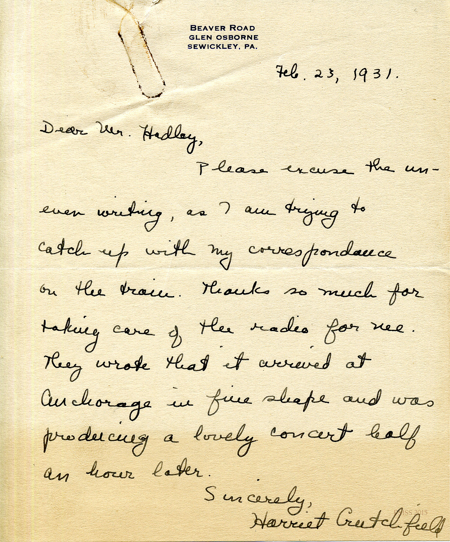 February 23, 1931. Handwritten by Harriet Crutchfield, Sewickley, PA, to Mr. (Hubert) Hadley. Thanks Hadley for taking care of radio for her. [014]