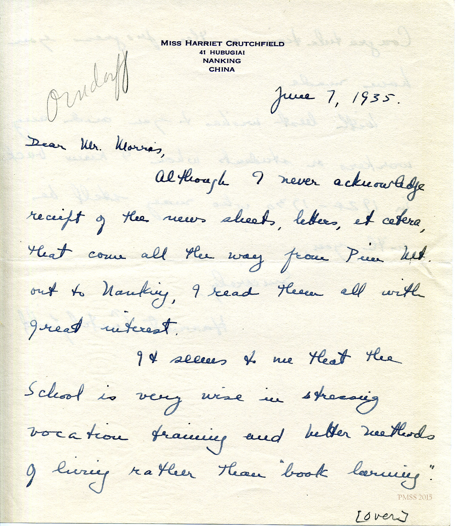 June 7, 1935. Handwritten by Harriet Crutchfield, Nanking, China, to Mr. (Glyn) Morris. Appreciates receiving P.M. material; agrees with Morris’ teaching policies. [016-016a]