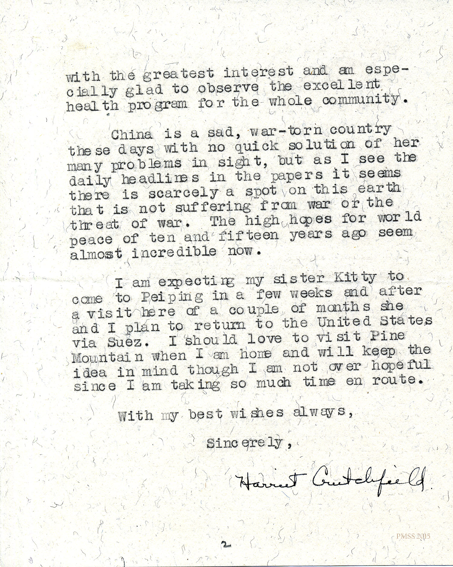 December 20, 1938. Harriet Crutchfield, American Embassy, Peiping, China. Sends contribution to P.M. School; asked to purchase a “homespun” to cover her P.M. photograph album; mentions her sister Grace’s visit to P.M. [017]