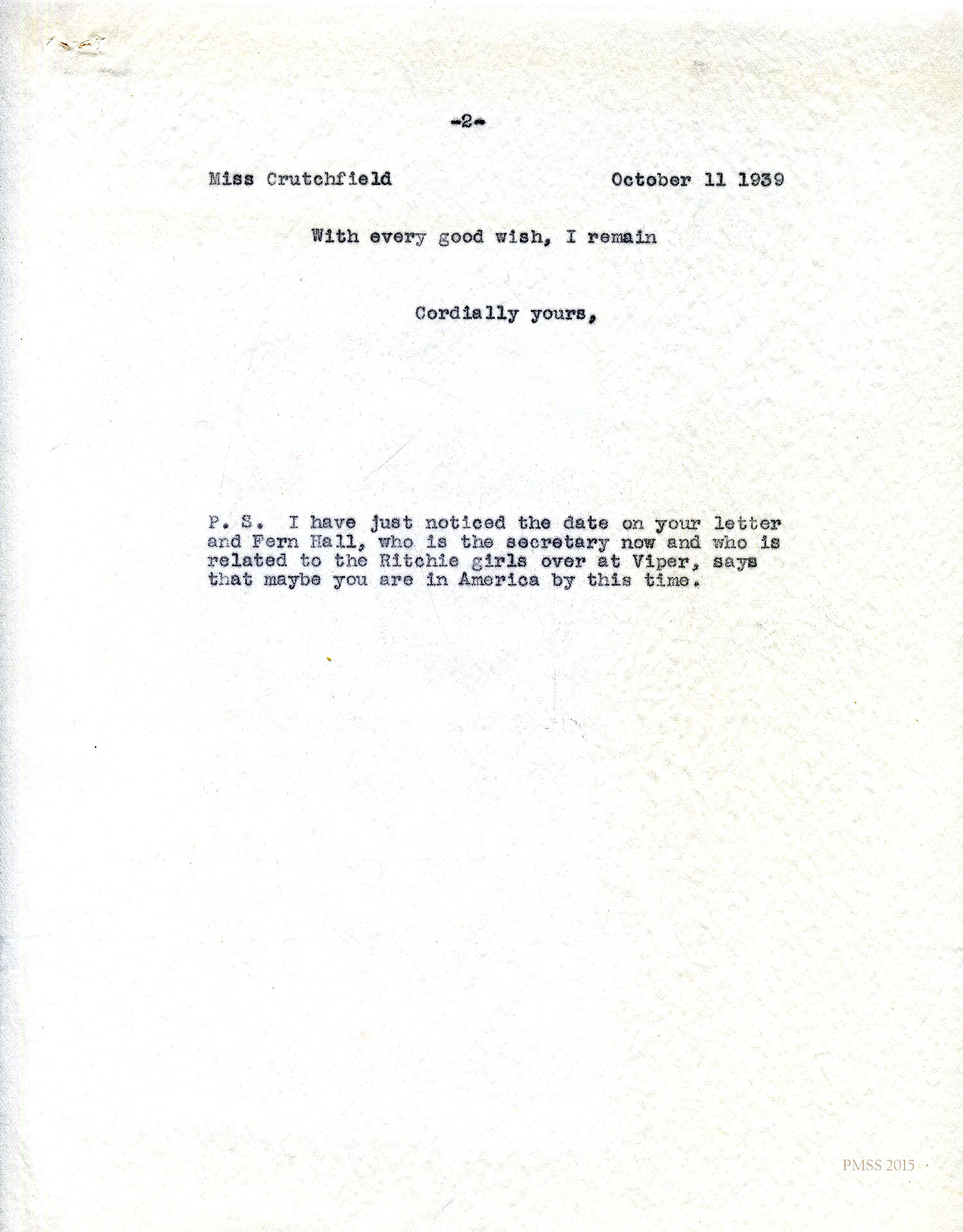 P.S. I have just noticed the date on your letter and Fern Hall, who is the secretary now and who is related to the Ritchie girls over at Viper, says that maybe you are in America by this time.