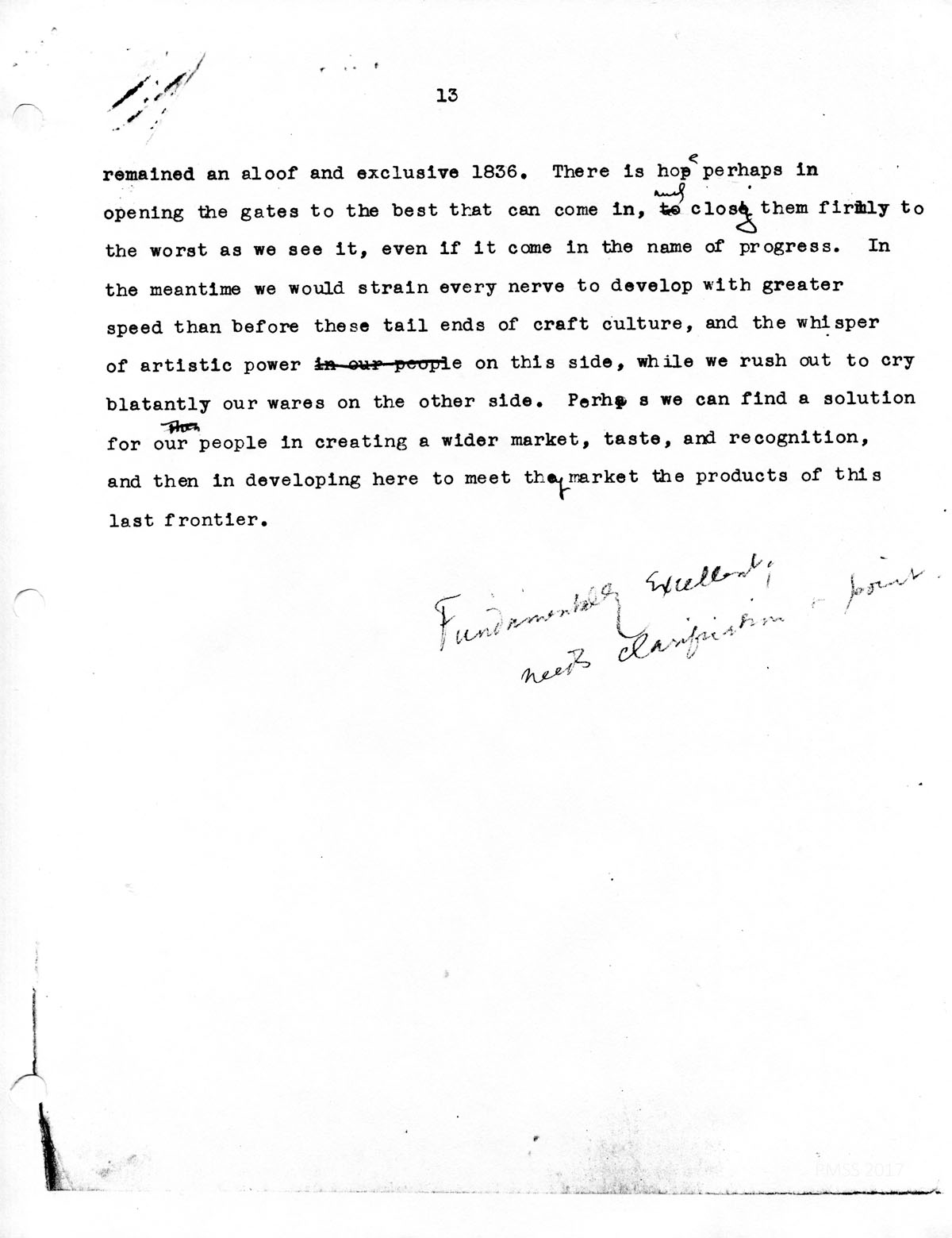 …remained an aloof and exclusive 1836. There is hope perhaps in opening the gates to the best that can come in, and closing them firmly to the worst as we see it, even if it comes in the name of progress. In the meantime, we would strain every nerve to develop with greater speed than before these tail ends of craft culture, and the whisper of artistic power on this side, while we rush out to cry blatantly our wares on the other side. Perhaps we can find a solution for our people in creating a wider market, taste, and recognition, and then in developing here to meet the[?] market the products of this last frontier.