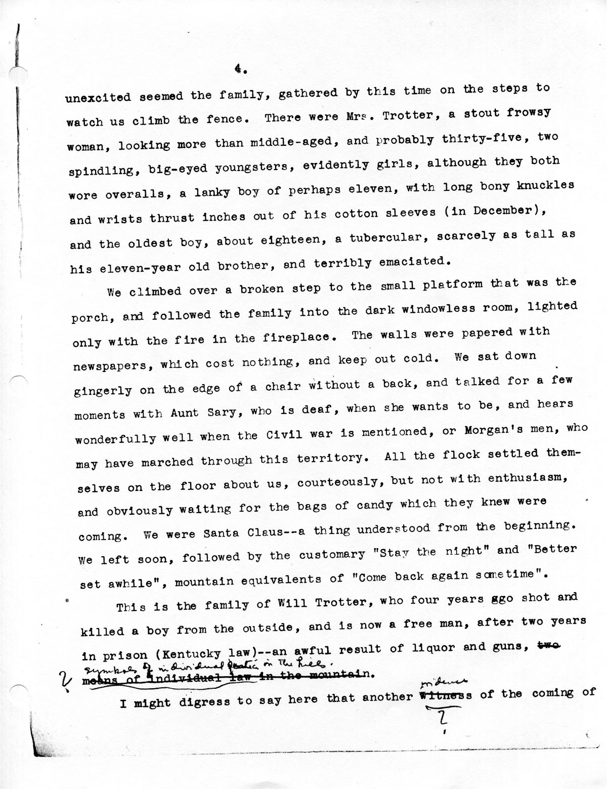 …unexcited seemed the family, gathered by this time on the steps to watch us climb the fence. There were Mrs. Trotter, a stout frowsy woman, looking more than middle-aged, and probably thirty-five, two spindling, big-eyed youngsters, evidently girls, although they both wore overalls, a lanky boy of perhaps eleven, with long bony knuckles and wrists thrust inches out of his cotton sleeves (in December), and the oldest boy, about eighteen, a tubercular, scarcely as tall as his eleven-year old brother, and terribly emaciated.