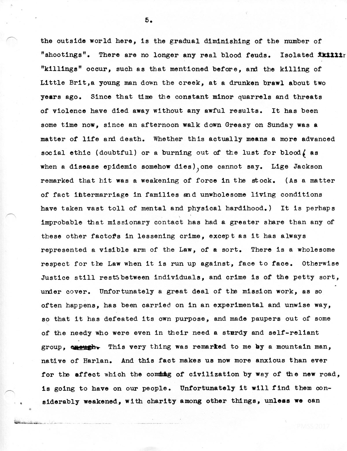 the outside world here, is the gradual diminishing of the number of “shootings.” There are no longer any real blood feuds. Isolated “killings” occur, such as that mentioned before, and the killing of Little Brit, a young man down the creek, at a drunken brawl about two years ago. Since that time the constant minor quarrels and threats of violence have died away without any awful results. It has been some time now since an afternoon walk down Greasy on Sunday was a matter of life and death. Whether this actually means a more advanced social ethic (doubtful) or a burning out of the lust for blood (as when a disease epidemic somehow dies), one cannot say. Lige Jackson remarked that hit was a weakening of force in the stock. (As a matter of fact intermarriage in families and unwholesome living conditions have taken vast toll of mental and physical hardihood.) It is perhaps improbable that missionary contact has had a greater share than any of these other factors in lessening crime, except as it has always represented a visible arm of the Law, of a sort. There is a wholesome respect for the Law when it is run up against, face to face. Otherwise, Justice still rests between individuals, and crime is of the petty sort, under cover. Unfortunately, a great deal of the mission work, as so often happens, has been carried on in an experimental and unwise way, so that it has defeated its own purpose, and made paupers out of some of the needy who were even in their need a sturdy and self-reliant group. This very thing was remarked to me by a mountain man, native of Harlan. And this fact makes us now more anxious than ever for the effect which the coming of civilization by way of the new road, is going to have on our people. Unfortunately, it will find them considerably weakened, with charity among other things, unless we can…