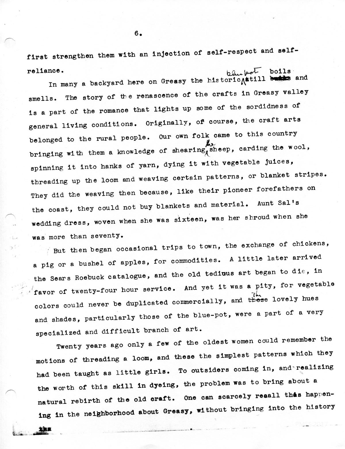 But then began occasional trips to town, the exchange of chickens, a pig or a bushel of apples, for commodities. A little later arrived the Sears Roebuck catalogue, and the old tedious art began to die, in favor of twenty-four hour service. And yet it was a pity, for vegetable colors could never be duplicated commercially, and the lovely hues and shades, particularly those of the blue-pot, were a part of a very specialized and difficult branch of art.