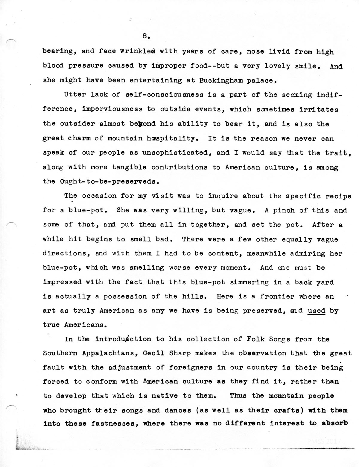 Utter lack of self-consciousness is a part of the seeming indifference, imperviousness to outside events, which sometimes irritates the outsider almost beyond his ability to bear it, and is also the great charm of mountain hospitality. It is the reason we never can speak of our people as unsophisticated, and I would say that the trait, along with more tangible contributions to American culture, is among the Ought-to-be-preserveds.