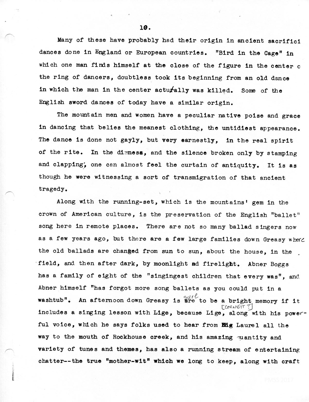 A “dance” down Greasy, in one of the cabins, is as impossible to describe as it is impossible ever to forget. It begins, always, at dusky-dark, by which time most of the crowd are gathered out in front of the house, and gradually are pushing into the small room. The room is a blue mixture of tobacco smoke and woodsmoke from the open fireplace It is not a large place, of ငourse, but shadowy and lighted only by the firelight or perhaps an oil lamp. The guests enter in small groups without saying much, if anything to the hosts, and gather about in the corners, or line up around the walls, until, a couple at a time, they step out to begin the dance. From that time on, the movement grows faster and faster, the caller’s voice grows louder and more shrill, and the dance goes on far past midnight, without a pause. One notes the complete absence of the usual chit-chat of social gatherings. Odors of tobacco, corn liquor, and perspiration all add to the atmosphere, which helps the clapping hands, the rhythmic movement of the dancers, the shrill bark of the caller, to take a sort of spiritual orgy out of the whirling figures.