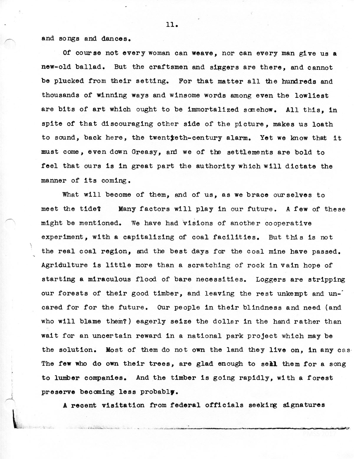 What will become of them, and of us, as we brace ourselves to meet the tide? Many factors will play in our future. A few of these might be mentioned. We have had visions of another cooperative experiment, with a capitalizing of coal facilities. But this is not the real coal region, and the best days for the coal mine have passed. Agriculture is little more than a scratching of rock in vain hope of starting a miraculous flood of bare necessities. Loggers are stripping our forests of their good timber, and leaving the rest unkempt and uncared for for the future. Our people in their blindness and need (and who will blame them? ) eagerly seize the dollar in the hand rather than wait for an uncertain reward in a national park project which may be the solution. Most of them do not own the land they live on, in any case. The few who do own their trees, are glad enough to sell them for a song to lumber companies. And the timber is going rapidly, with a forest preserve becoming less probable.